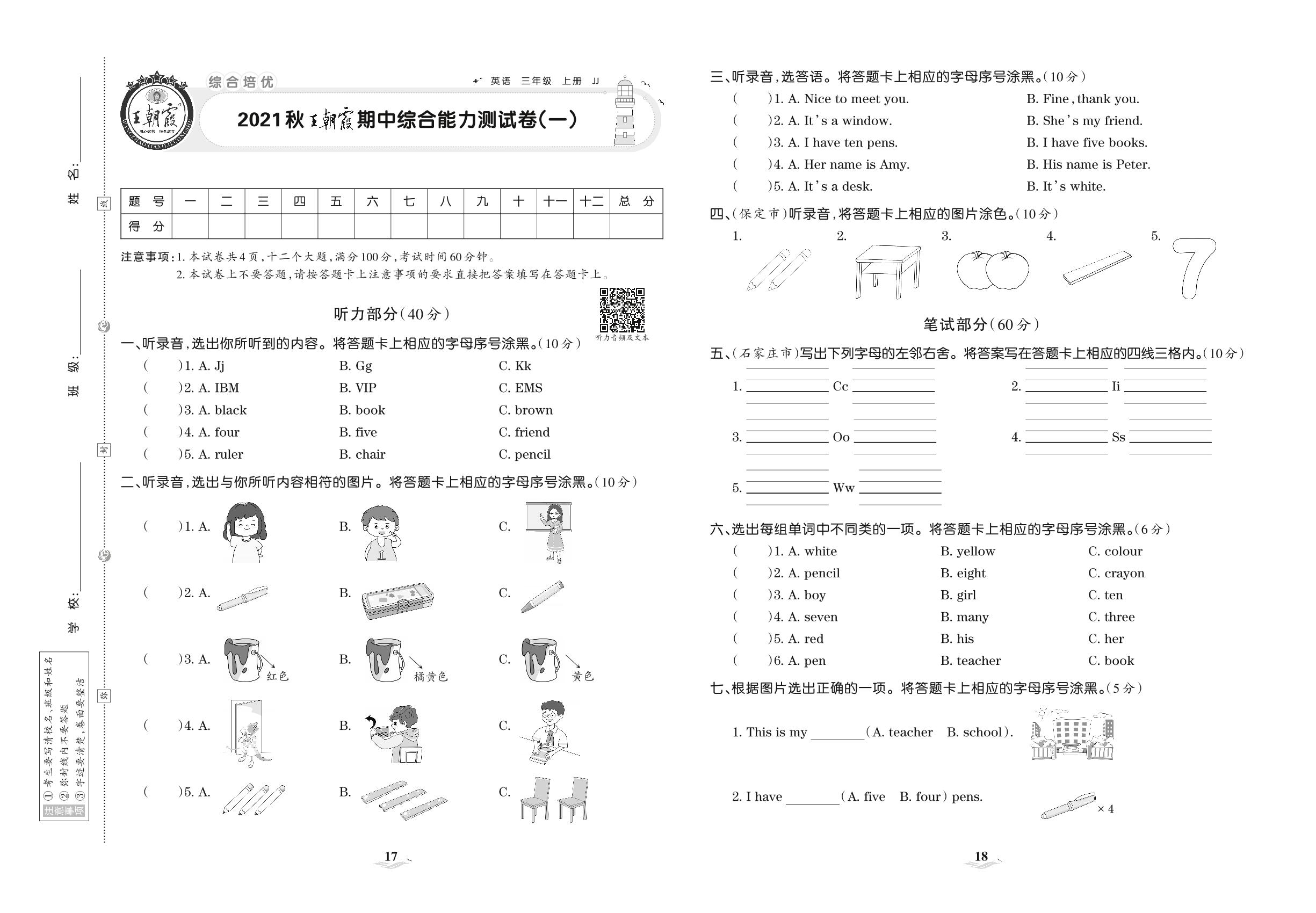 2021上册三年级英语冀教版 王朝霞期中综合能力测试卷(一)
