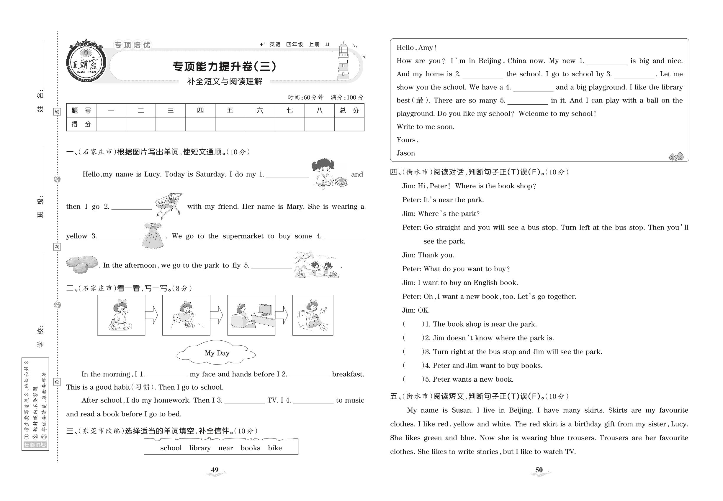 2021上册四年级英语冀教版 专项能力提升卷(三) 补全短文与阅读理解