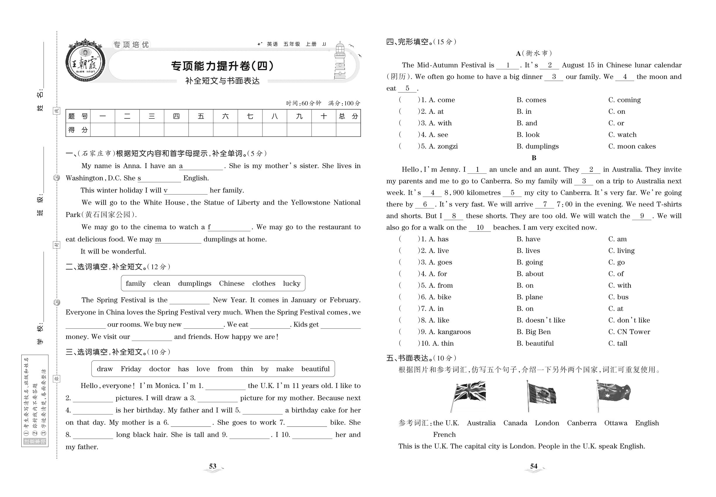 2021上册五年级英语冀教版 专项能力提升卷(四) 补全短文与书面表达