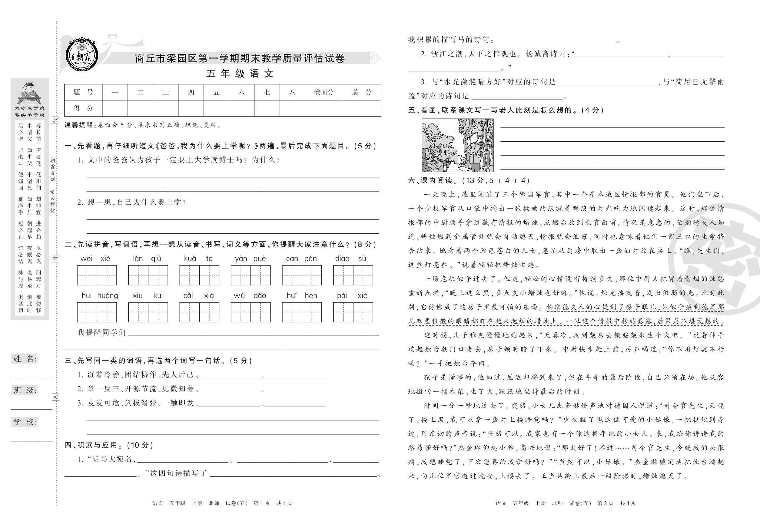2016-2017学年第一学期商丘市梁园区五年级语文试卷(北师版)【5】