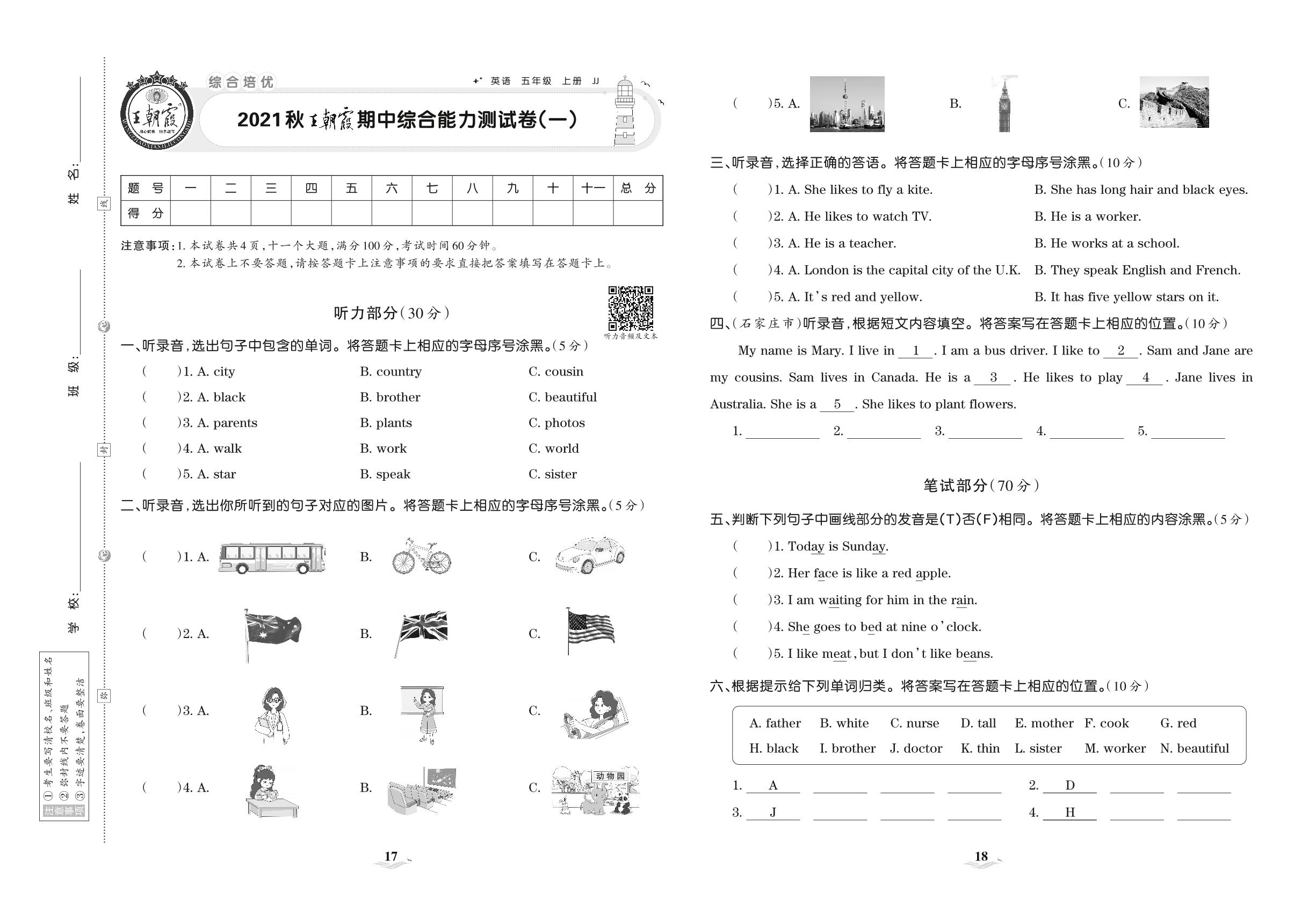 2021上册五年级英语冀教版 王朝霞期中综合能力测试卷(一)