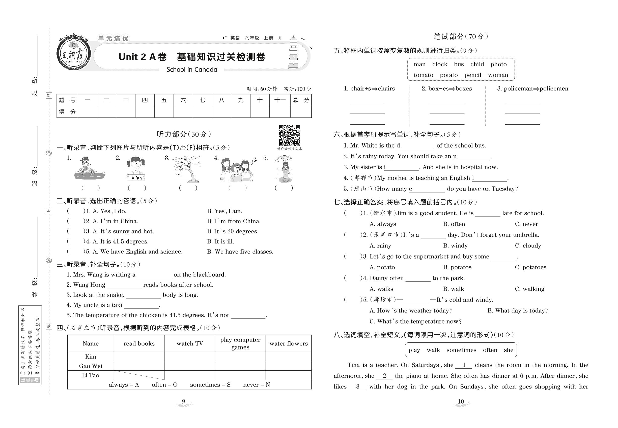 六年级英语冀教版上册单元卷