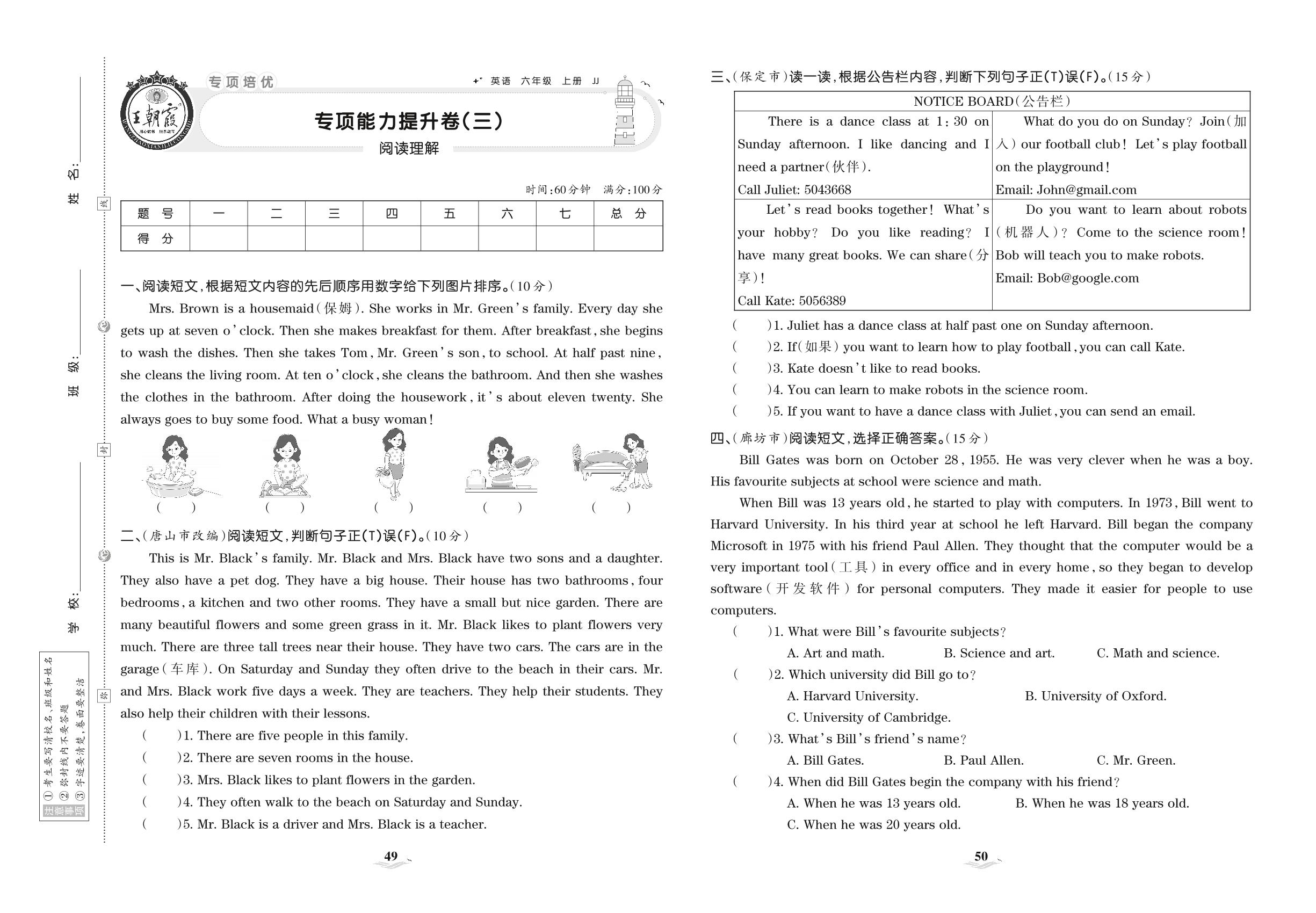 2021上册六年级英语冀教版 专项能力提升卷(三) 阅读理解