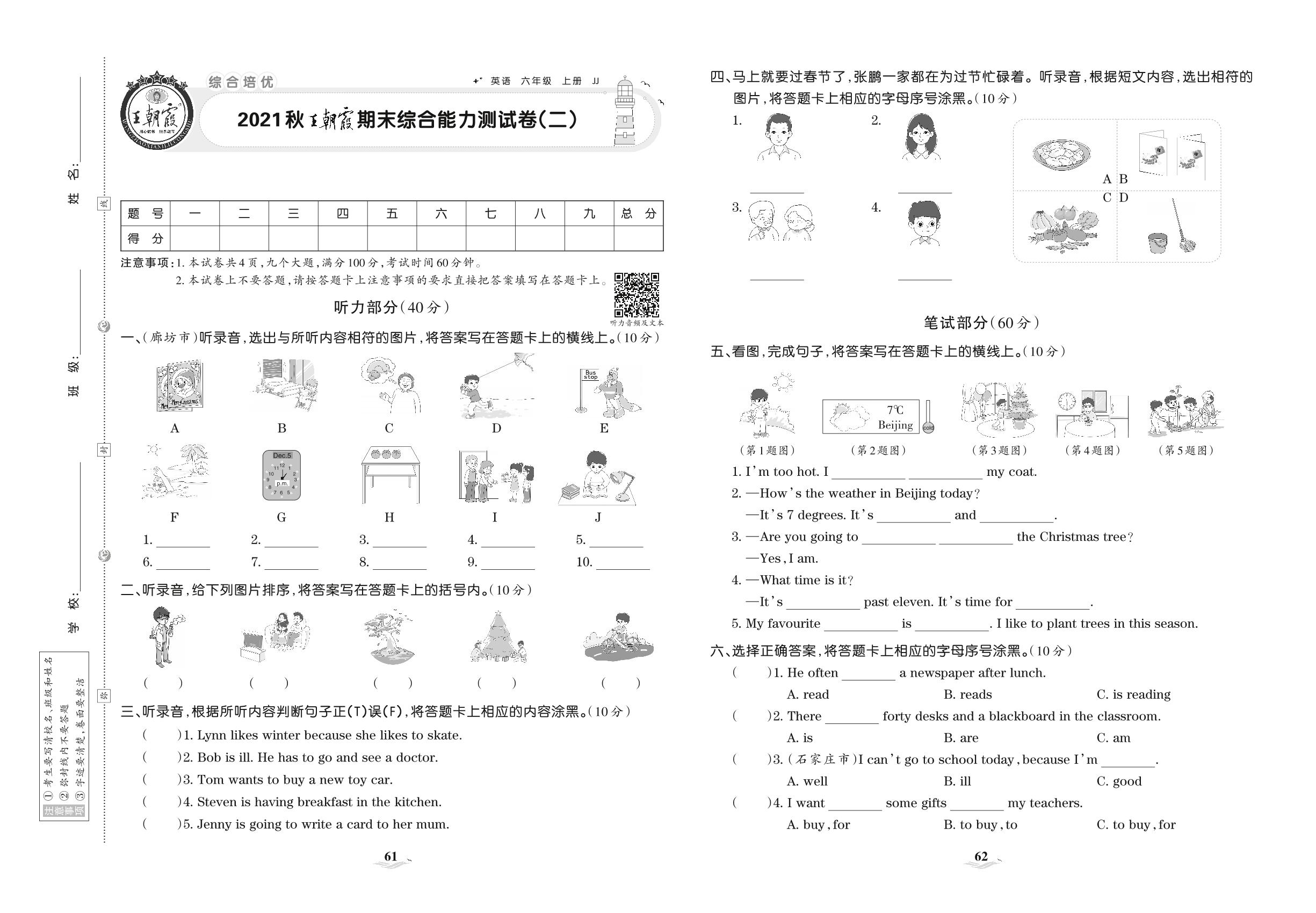 2021上册六年级英语冀教版 王朝霞期末综合能力测试卷(二)