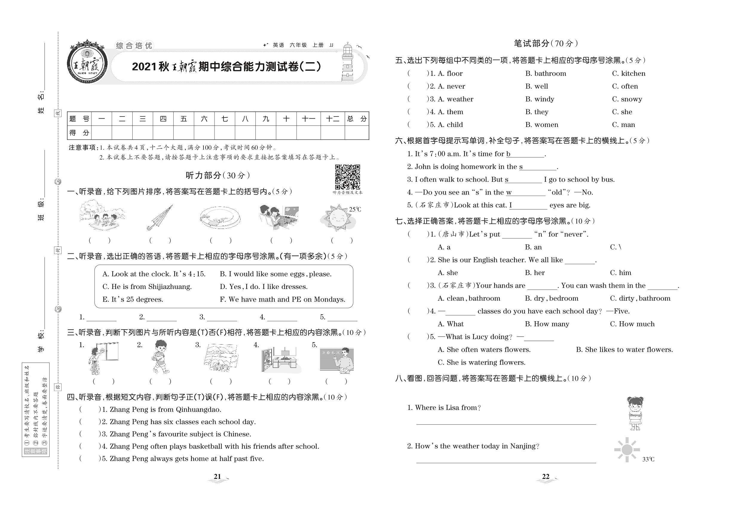 2021上册六年级英语冀教版 王朝霞期中综合能力测试卷(二)