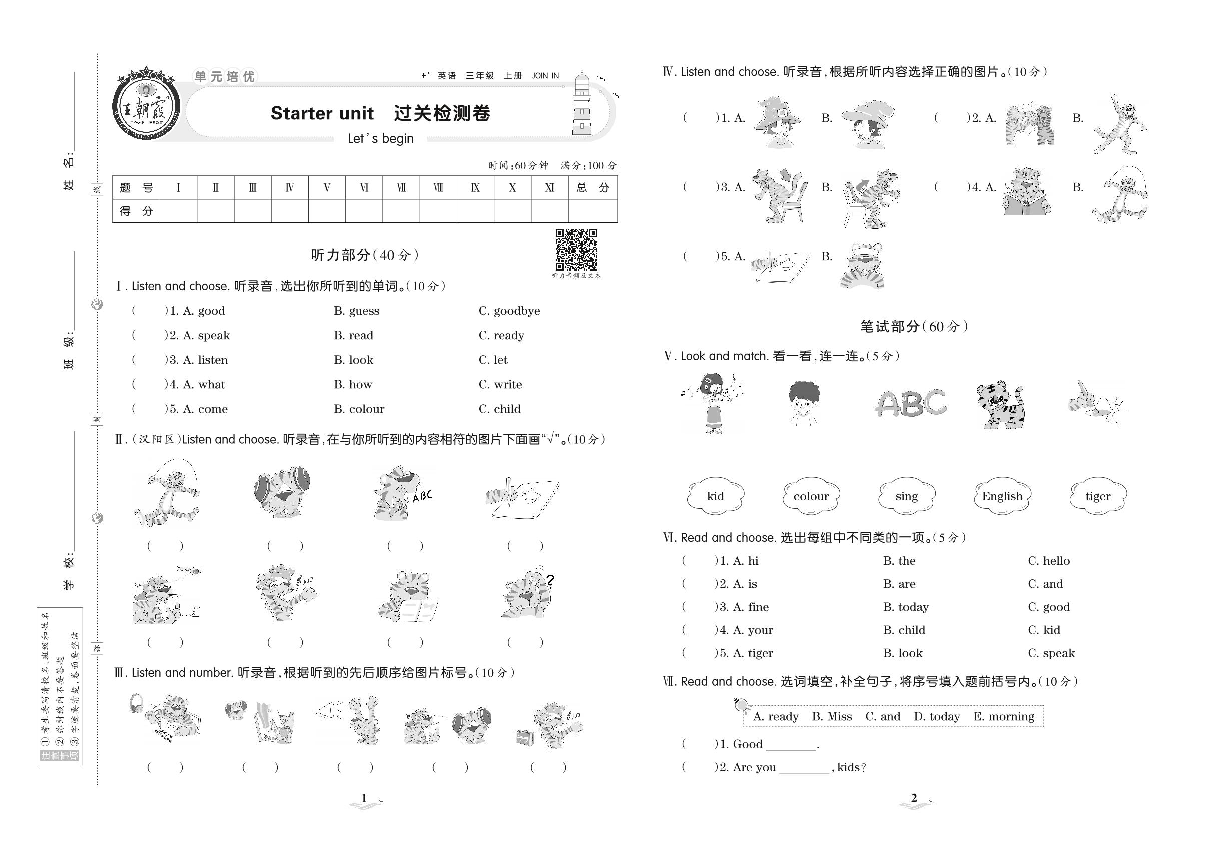 三年级英语剑桥版上册单元卷