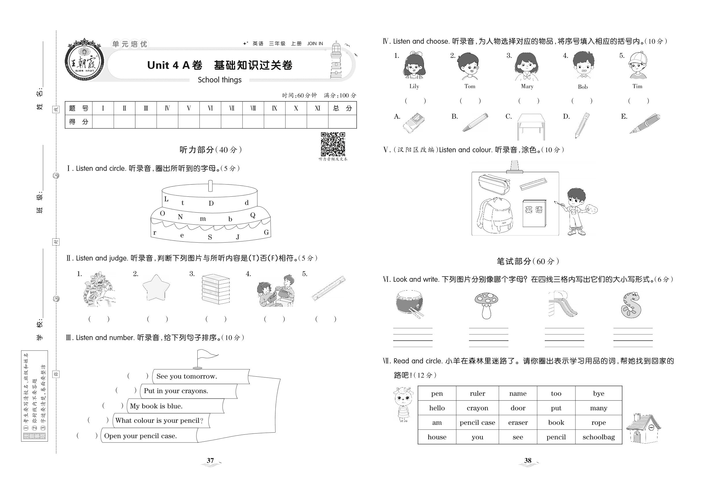三年级英语剑桥版上册单元卷