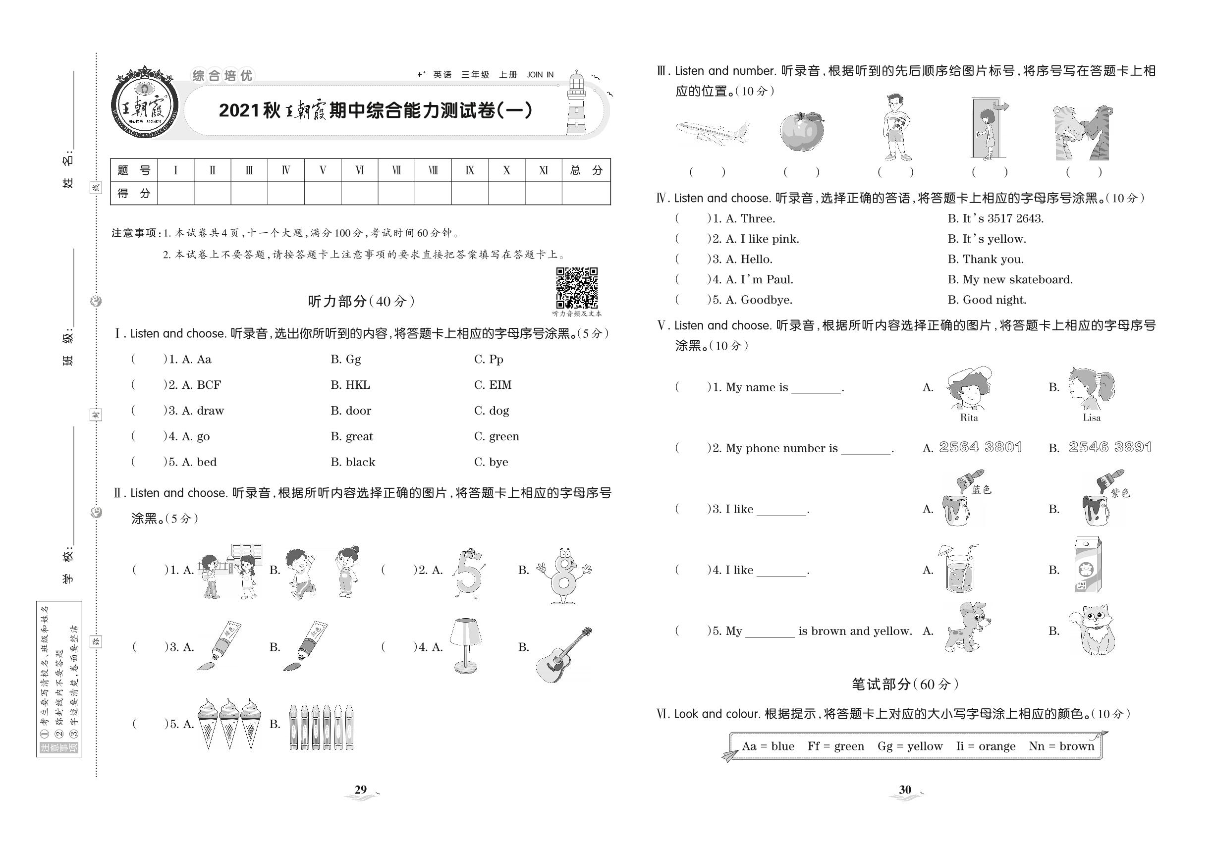 2021上册三年级英语剑桥版 王朝霞期中综合能力测试卷(一)