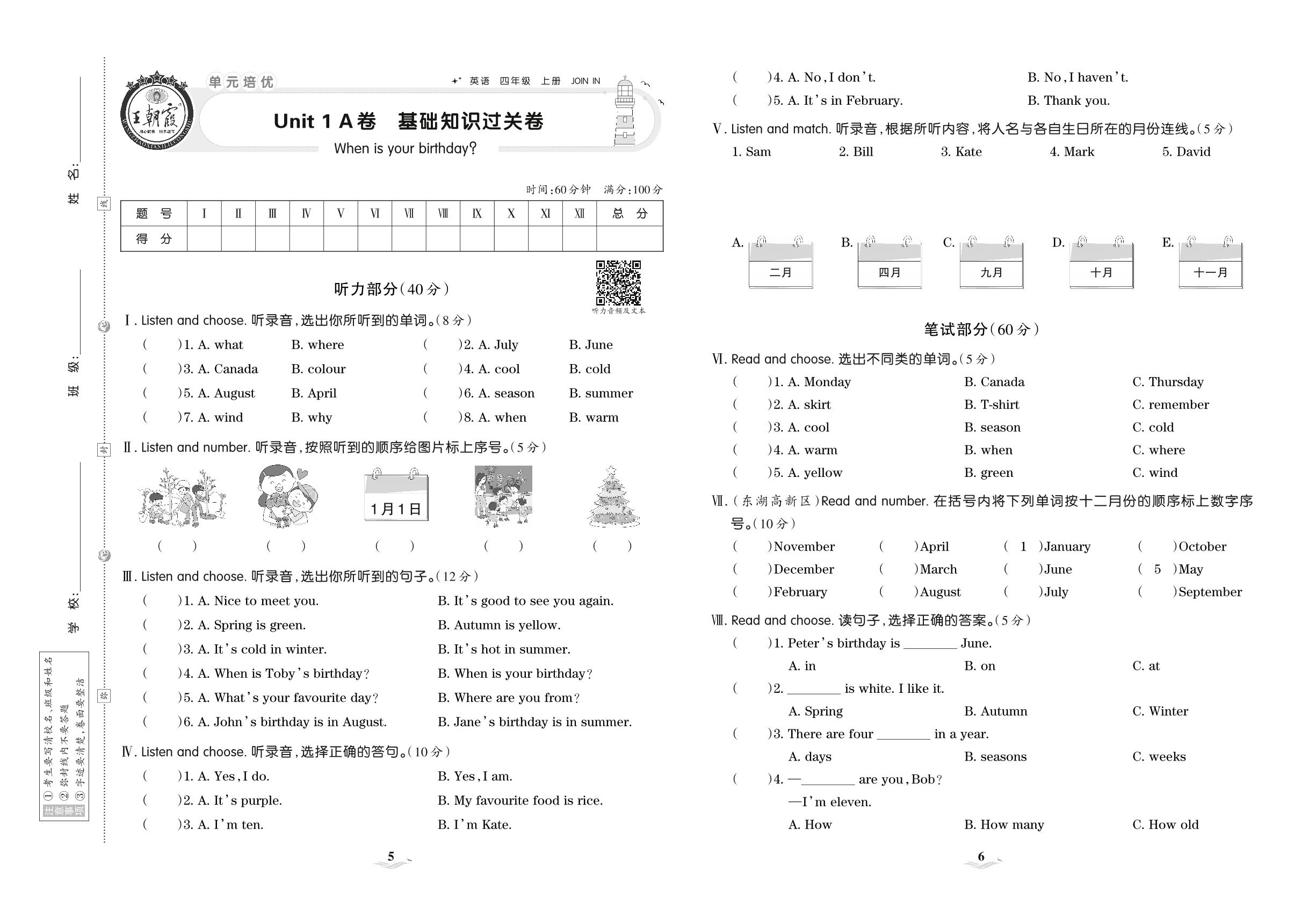 2021上册四年级英语剑桥版 Unit 1 A卷 基础知识过关卷