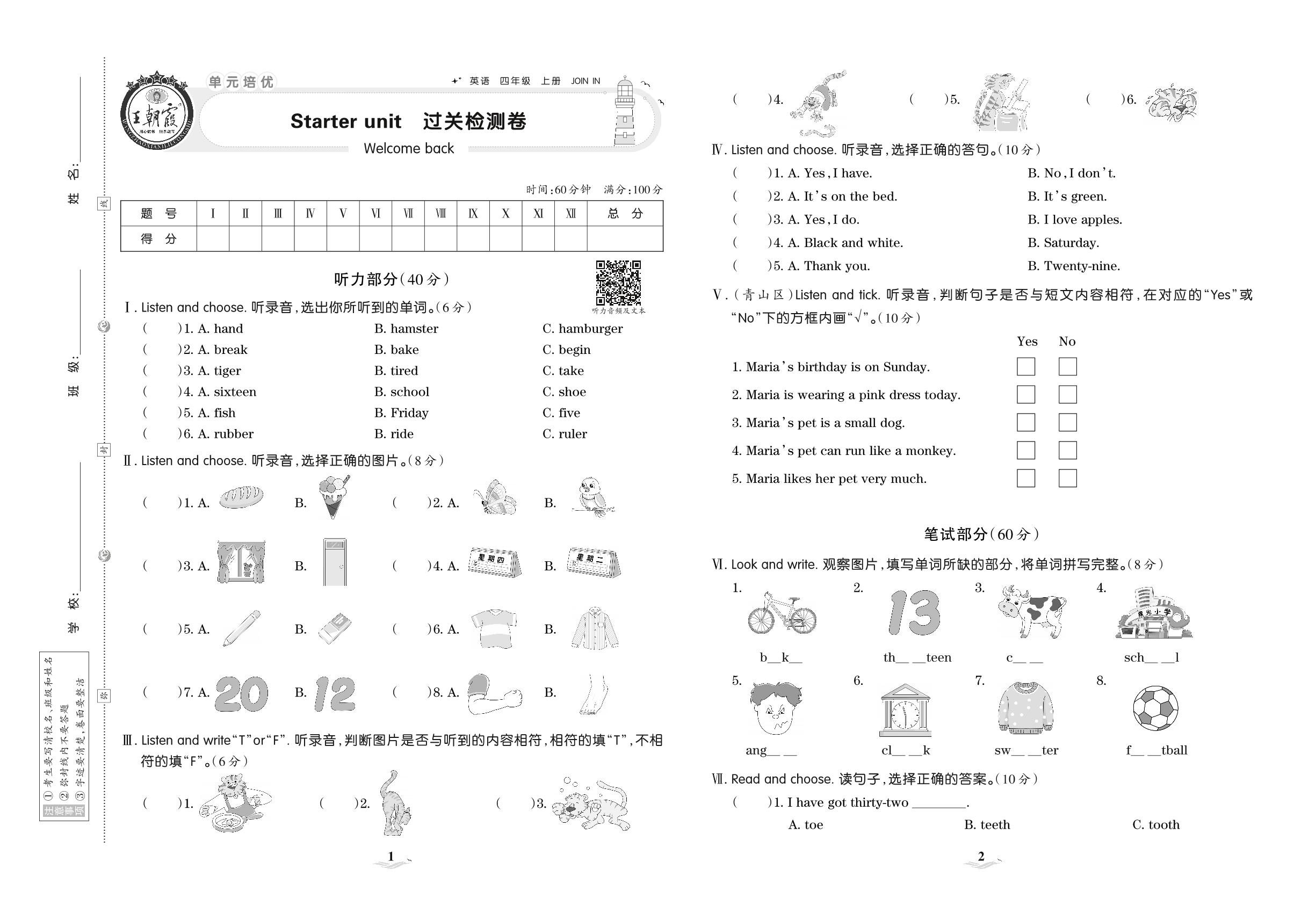 2021上册四年级英语剑桥版 Starter unit 过关检测卷