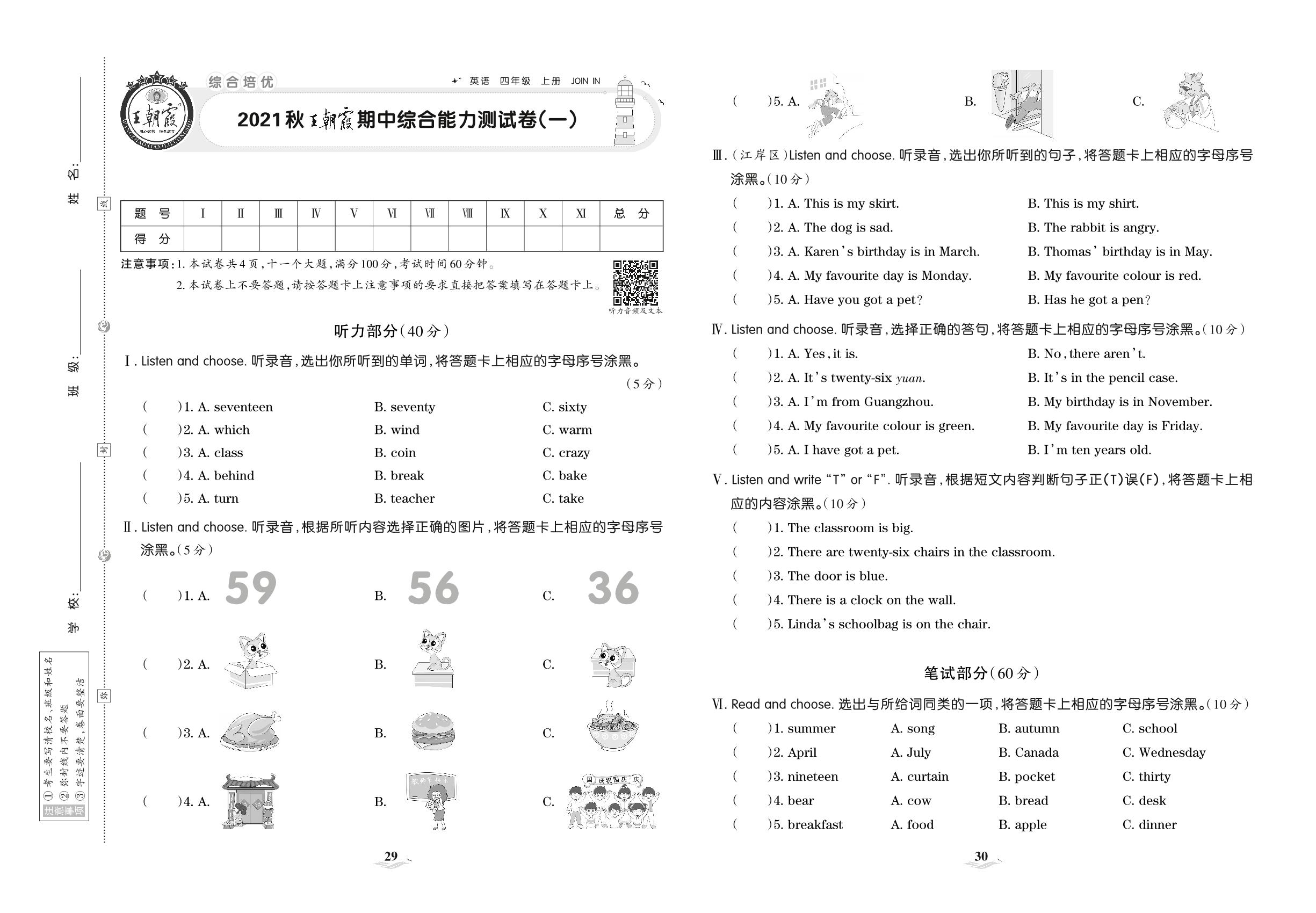2021上册四年级英语剑桥版 王朝霞期中综合能力测试卷(一)