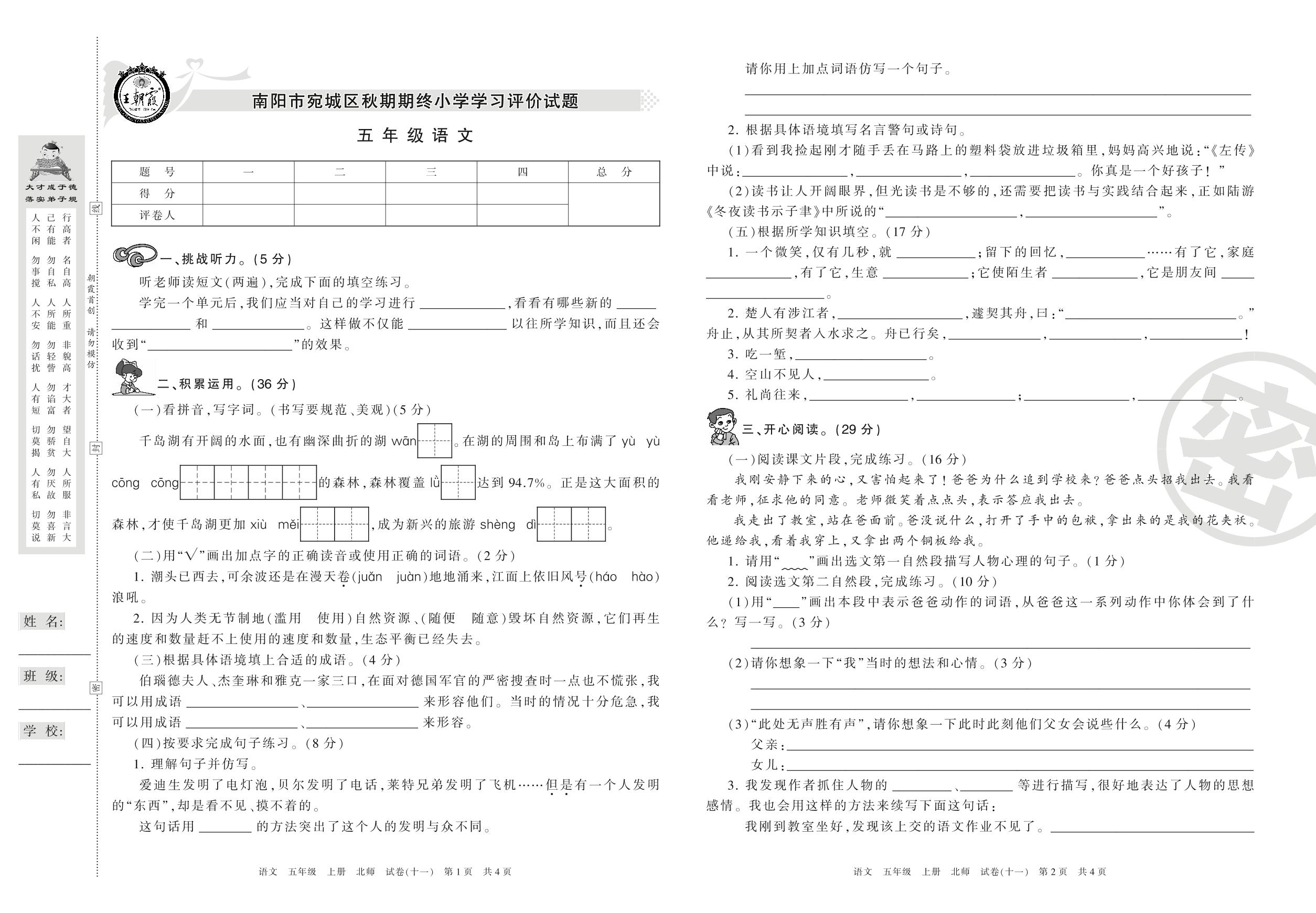 2016-2017学年第一学期南阳市宛城区五年级语文试卷(北师版)【11】