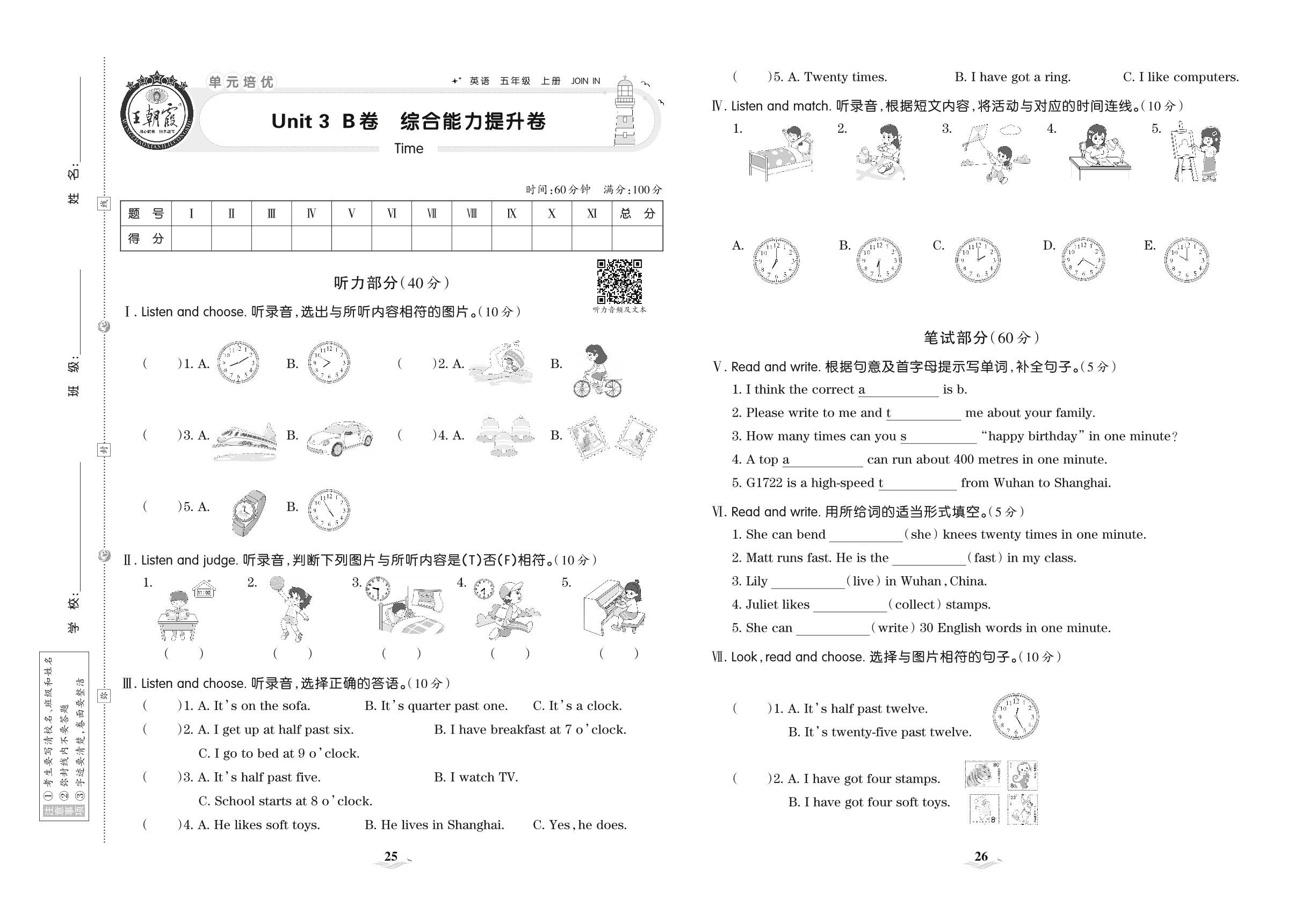 2021上册五年级英语剑桥版 Unit 3 B卷 综合能力提升卷