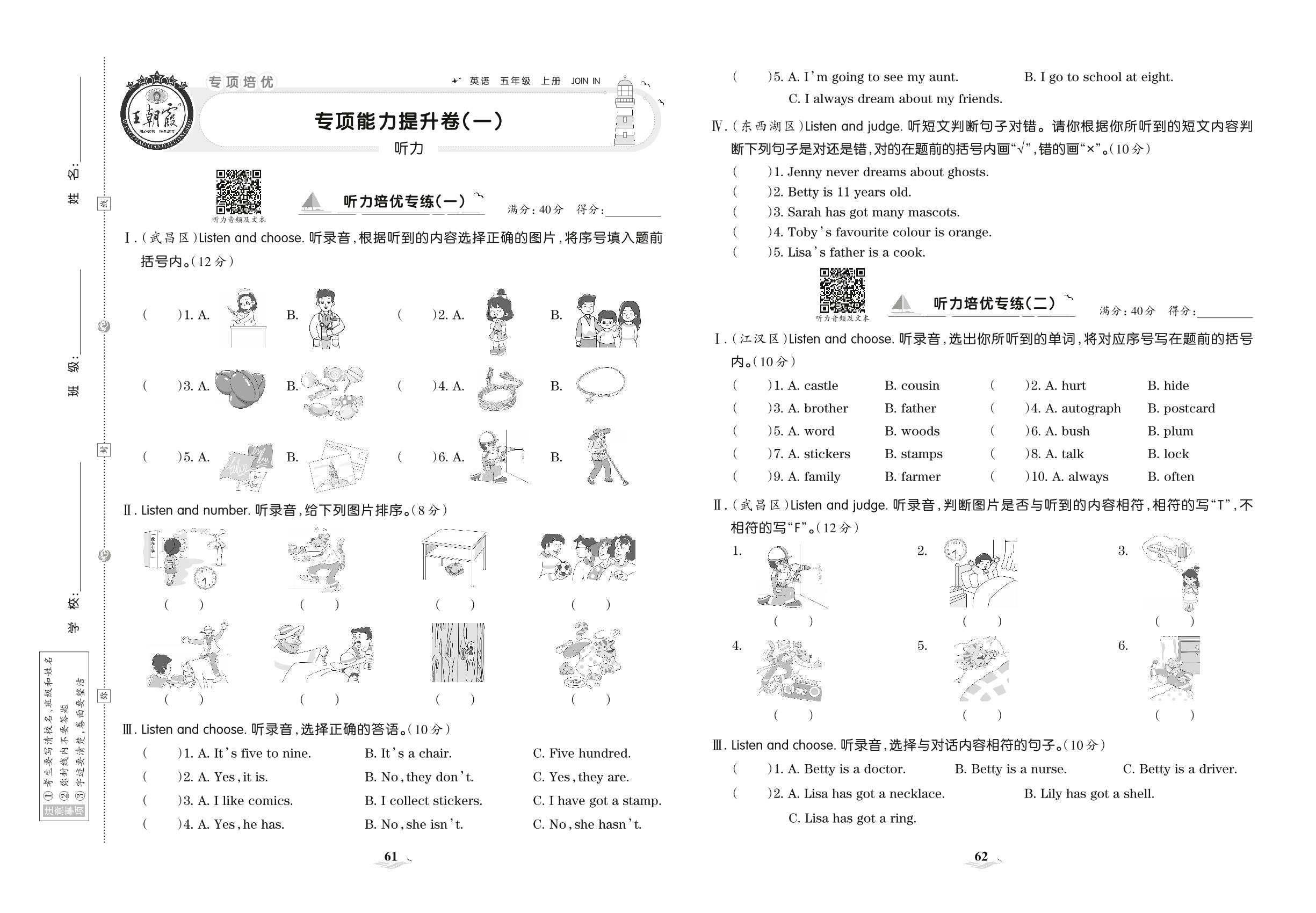 2021上册五年级英语剑桥版 专项能力提升卷(一) 听力