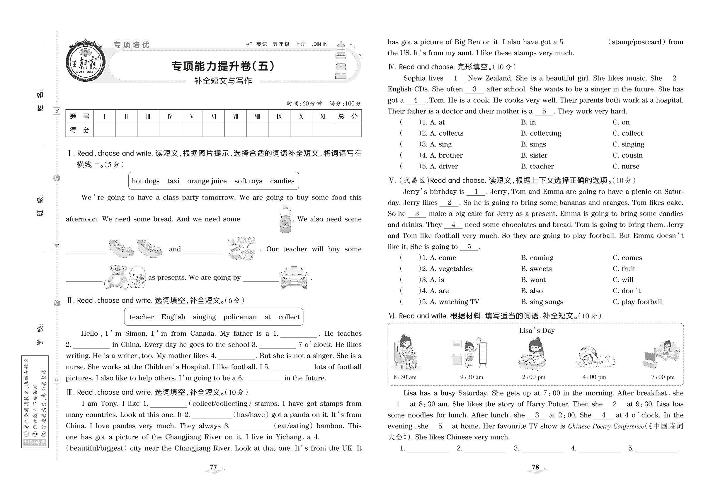 2021上册五年级英语剑桥版 专项能力提升卷(五) 补全短文与写作