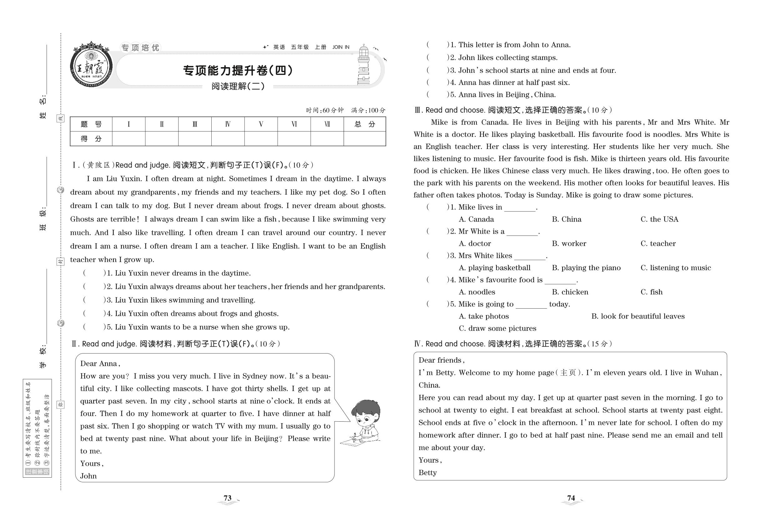 2021上册五年级英语剑桥版 专项能力提升卷(四) 阅读理解(二)