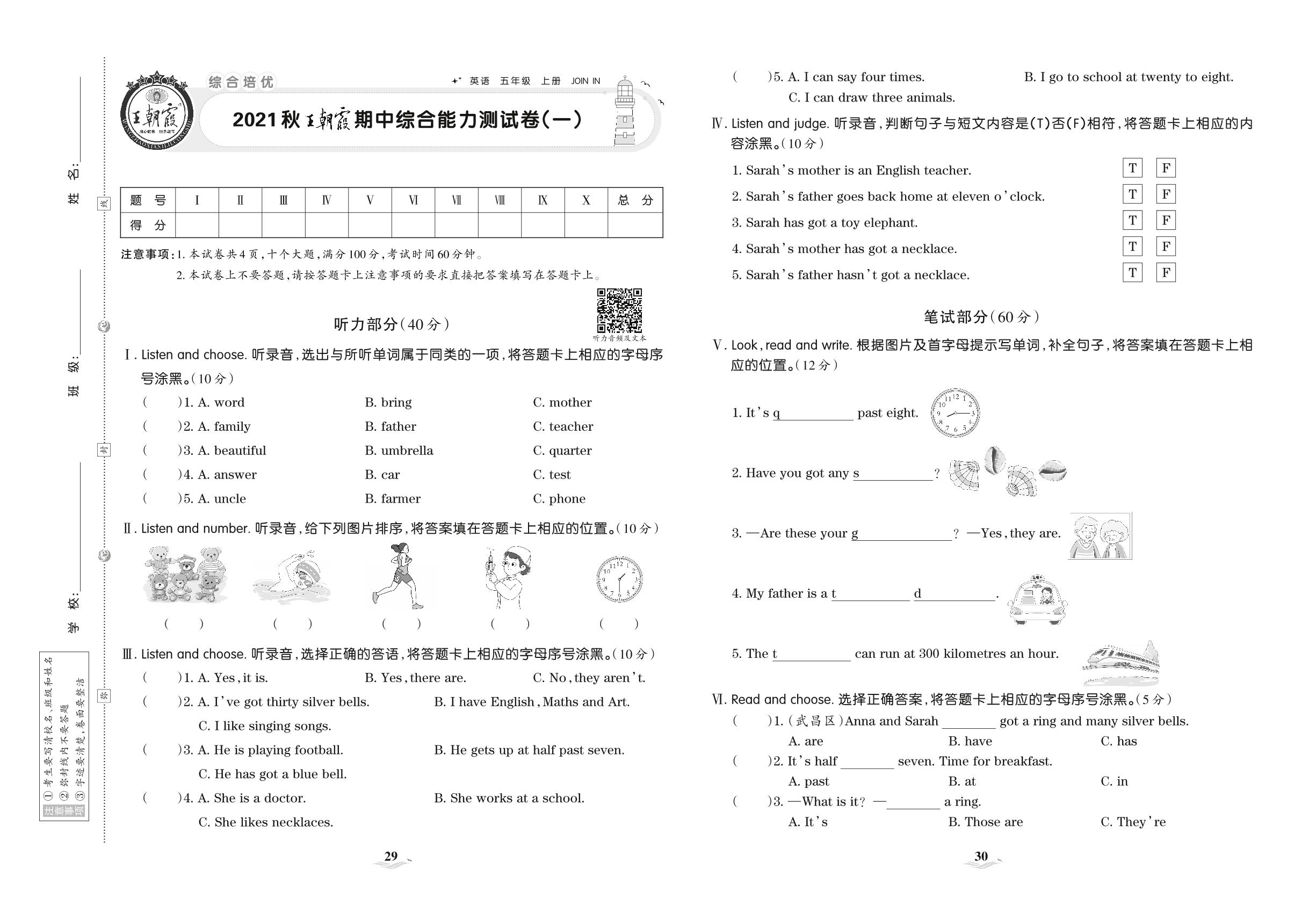2021上册五年级英语剑桥版 王朝霞期中综合能力测试卷(一)
