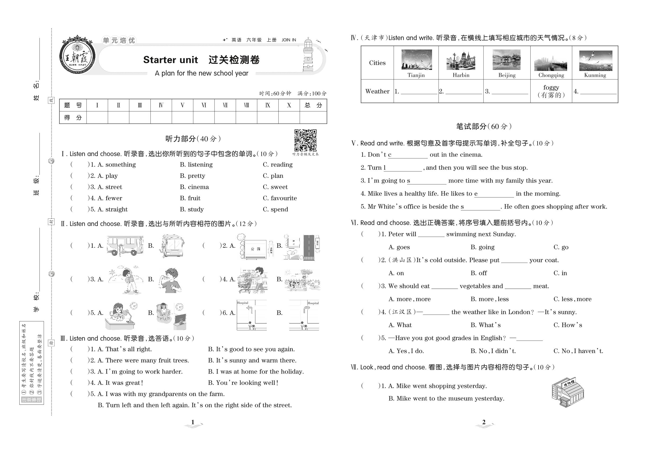 2021上册六年级英语剑桥版 Starter unit 过关检测卷