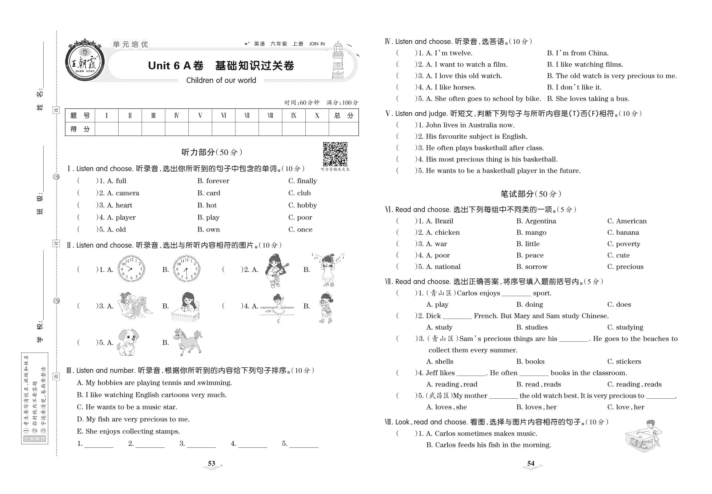 六年级英语剑桥版上册单元卷
