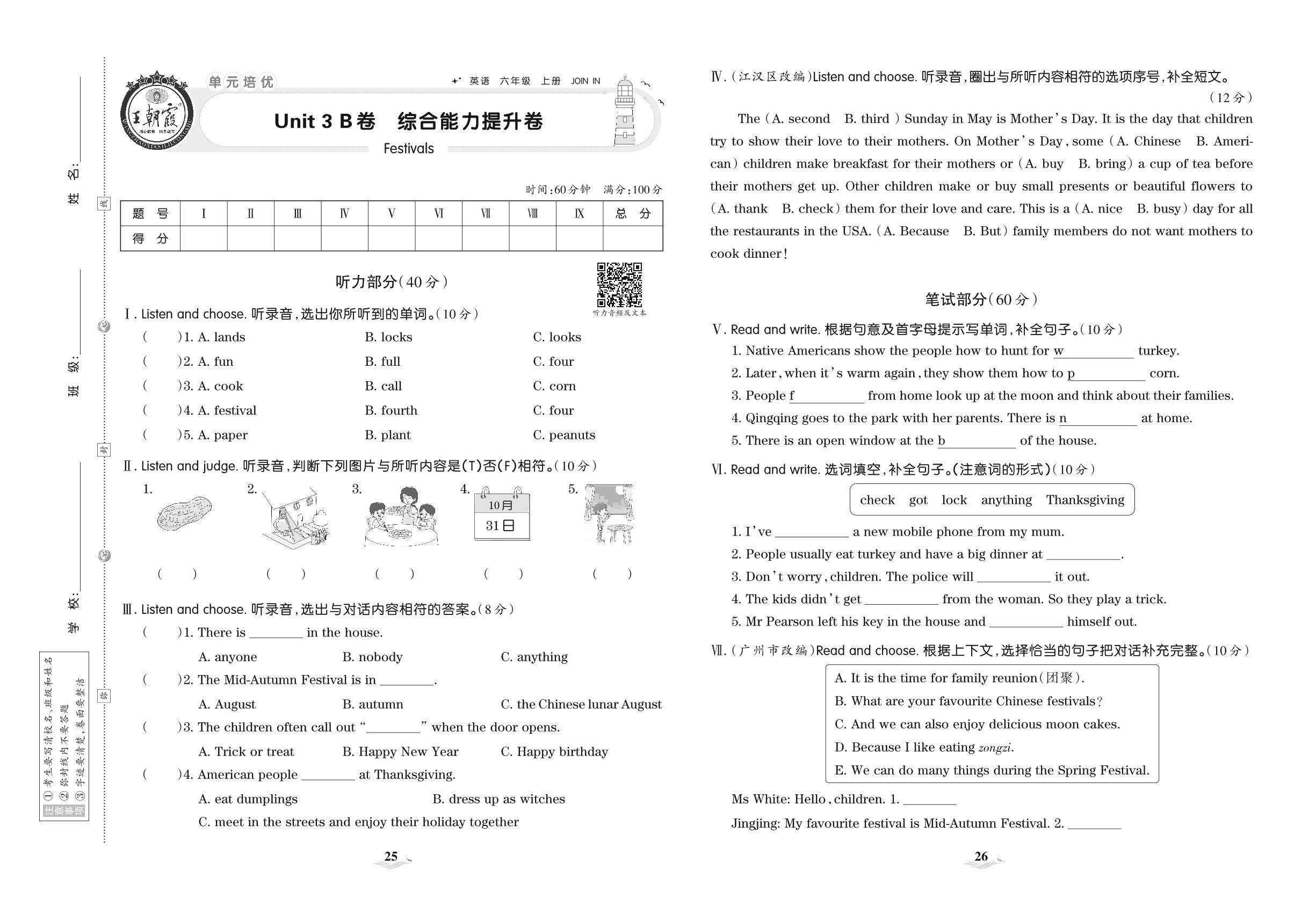 六年级英语剑桥版上册单元卷