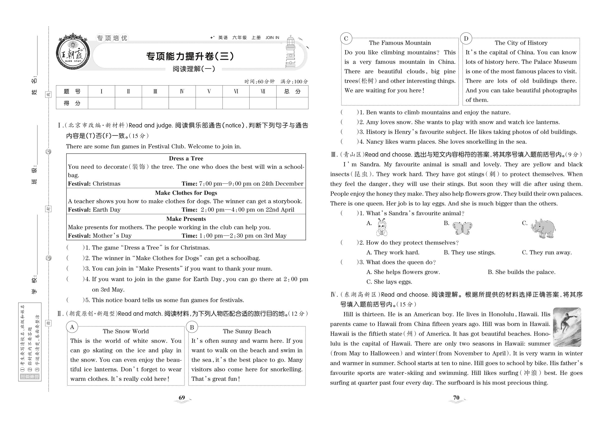 2021上册六年级英语剑桥版 专项能力提升卷(三) 阅读理解(一)