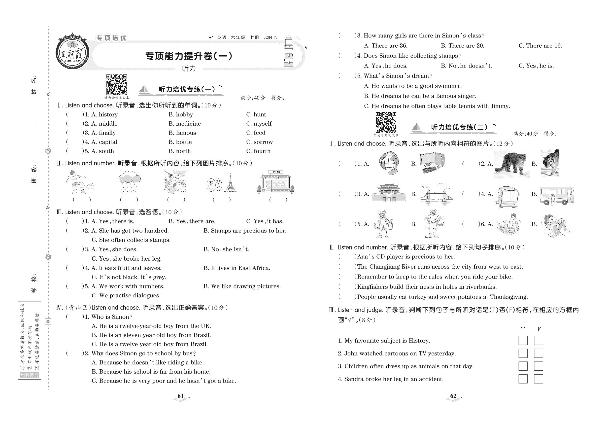 2021上册六年级英语剑桥版 专项能力提升卷(一) 听力