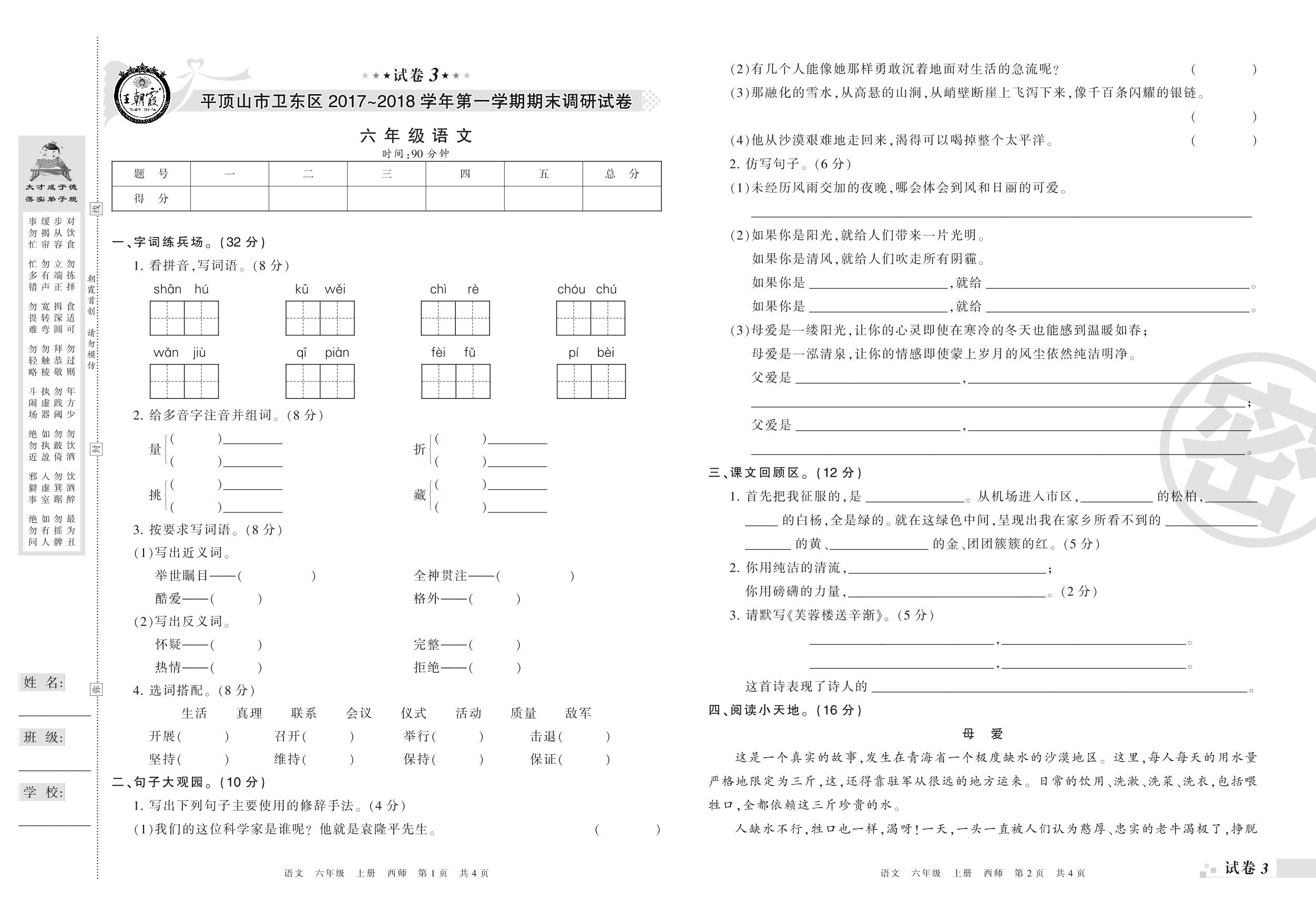 2017-2018学年第一学期平顶山市卫区六年级语文试卷(西师版)【3】