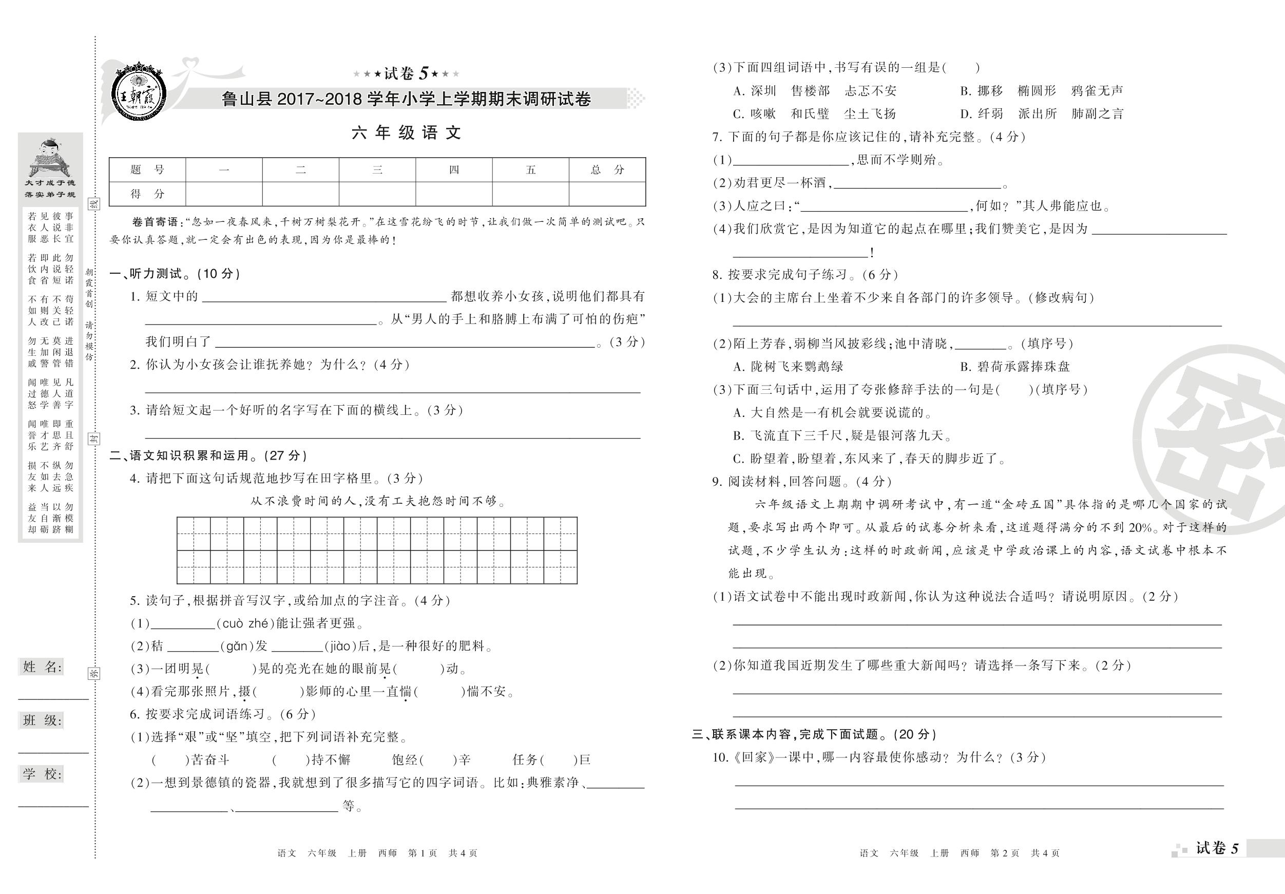 2017-2018学年第一学期鲁山县六年级语文试卷(西师版)【5】