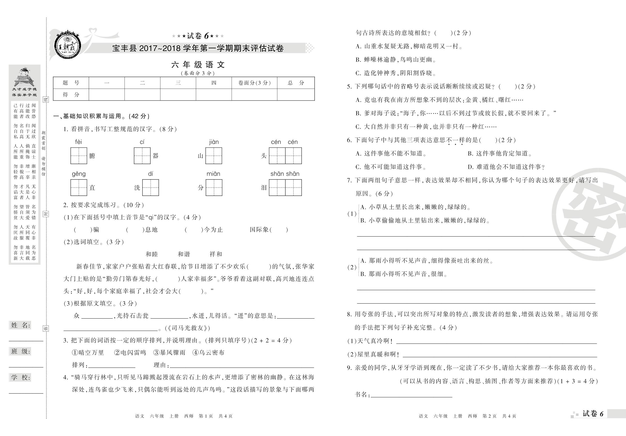 2017-2018学年第一学期汝宝丰县六年级语文试卷(西师版)【6】