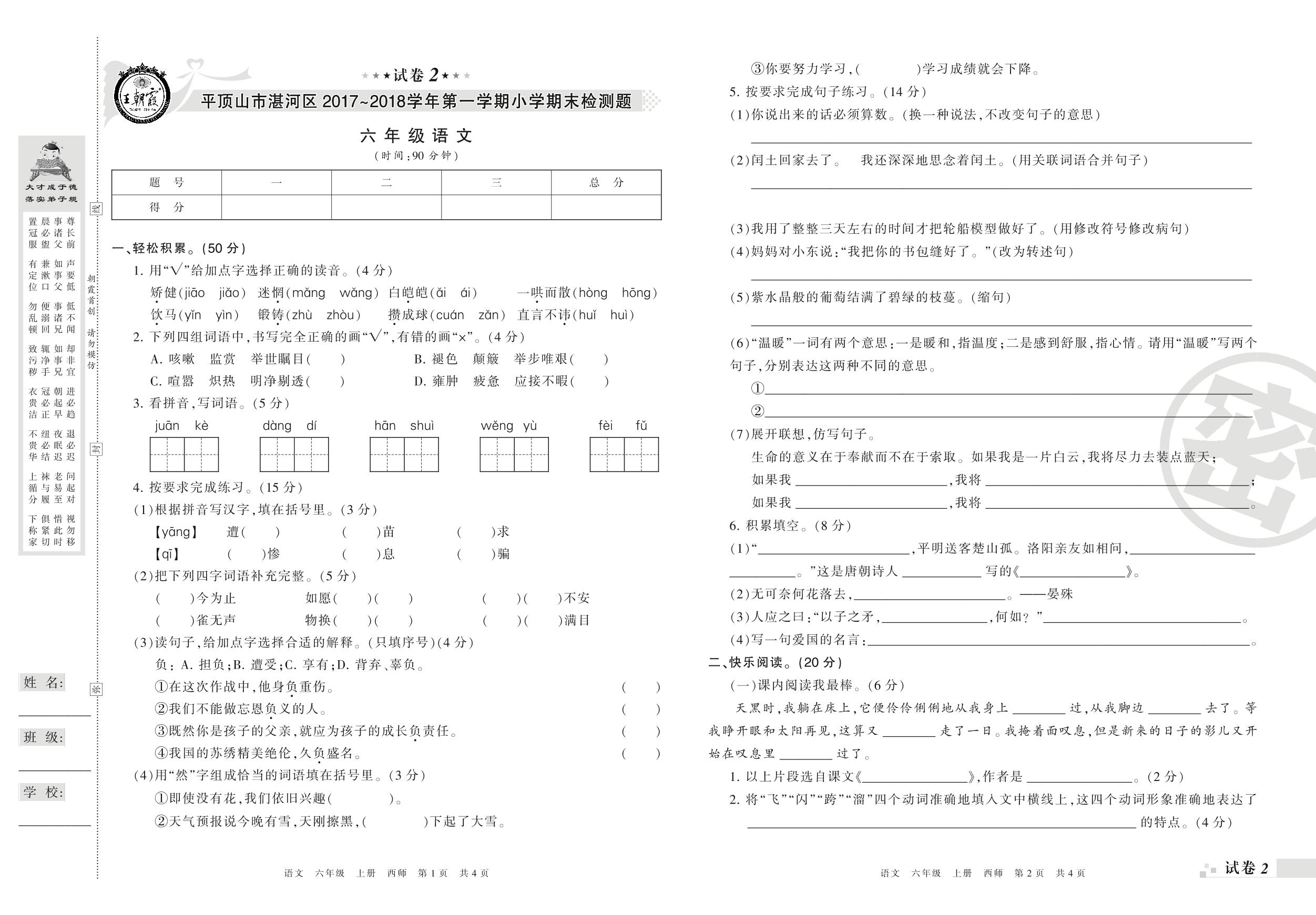 2017-2018学年第一学期平顶山市湛河区六年级语文试卷(西师版)【2】