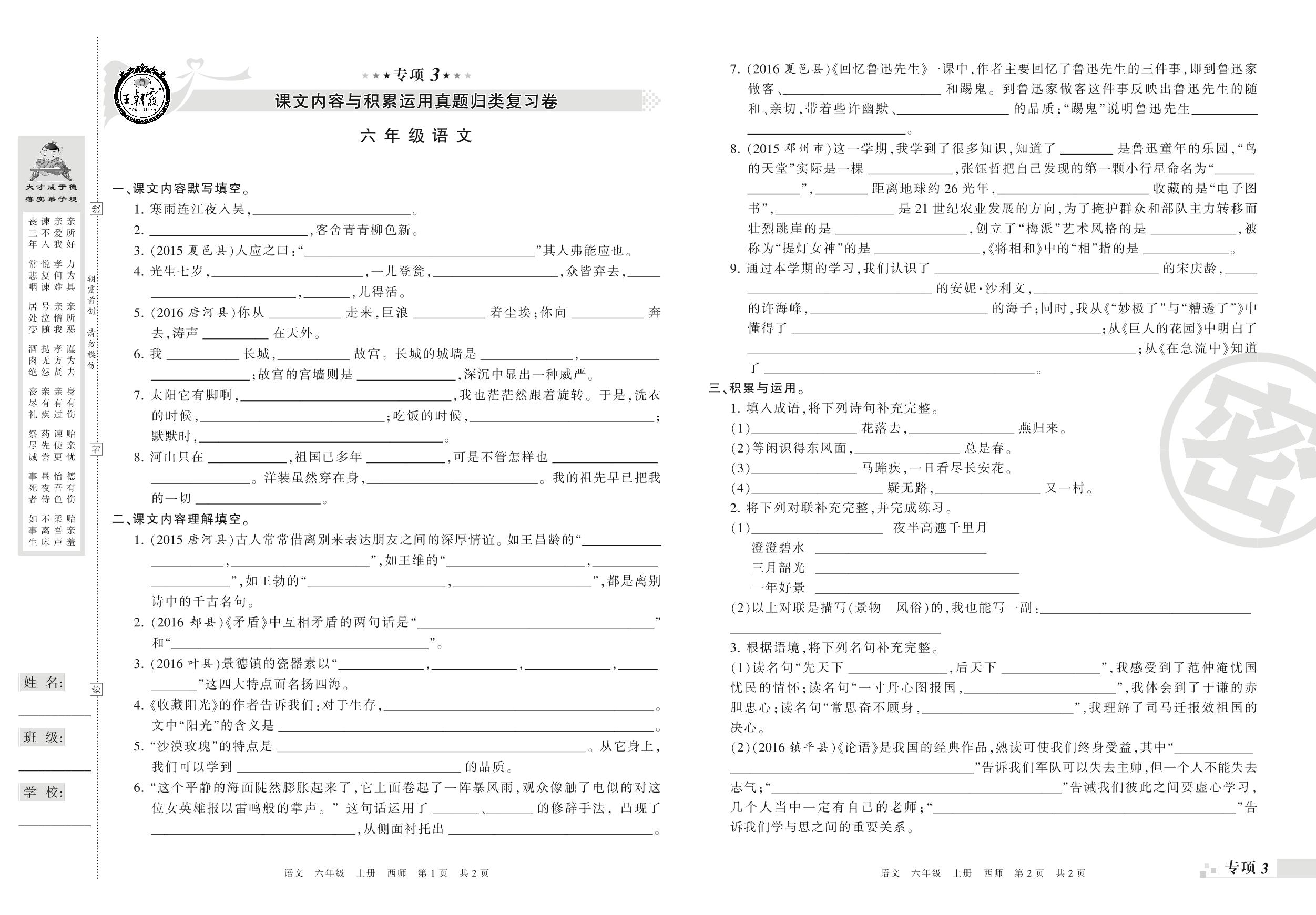王朝霞期末专项卷——课文内容与积累运用、课内阅读与写作真题归类复习卷六年级上册语文(西师版)【0】