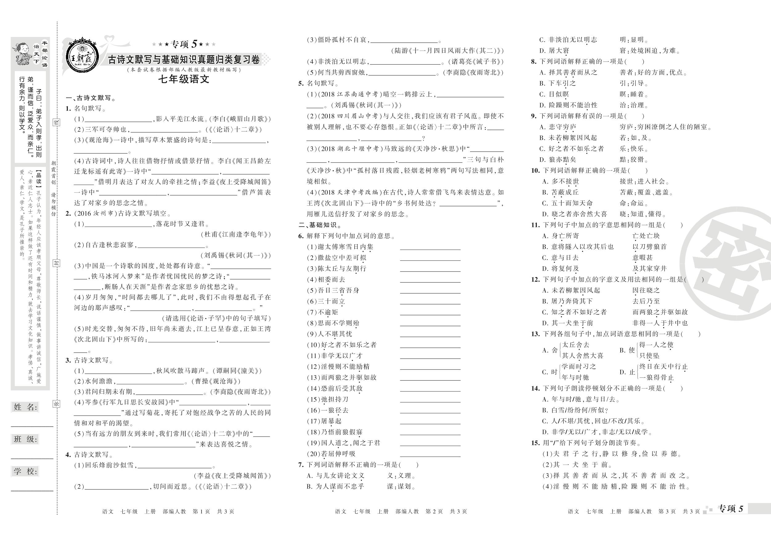 七年级语文人教版上册专项卷