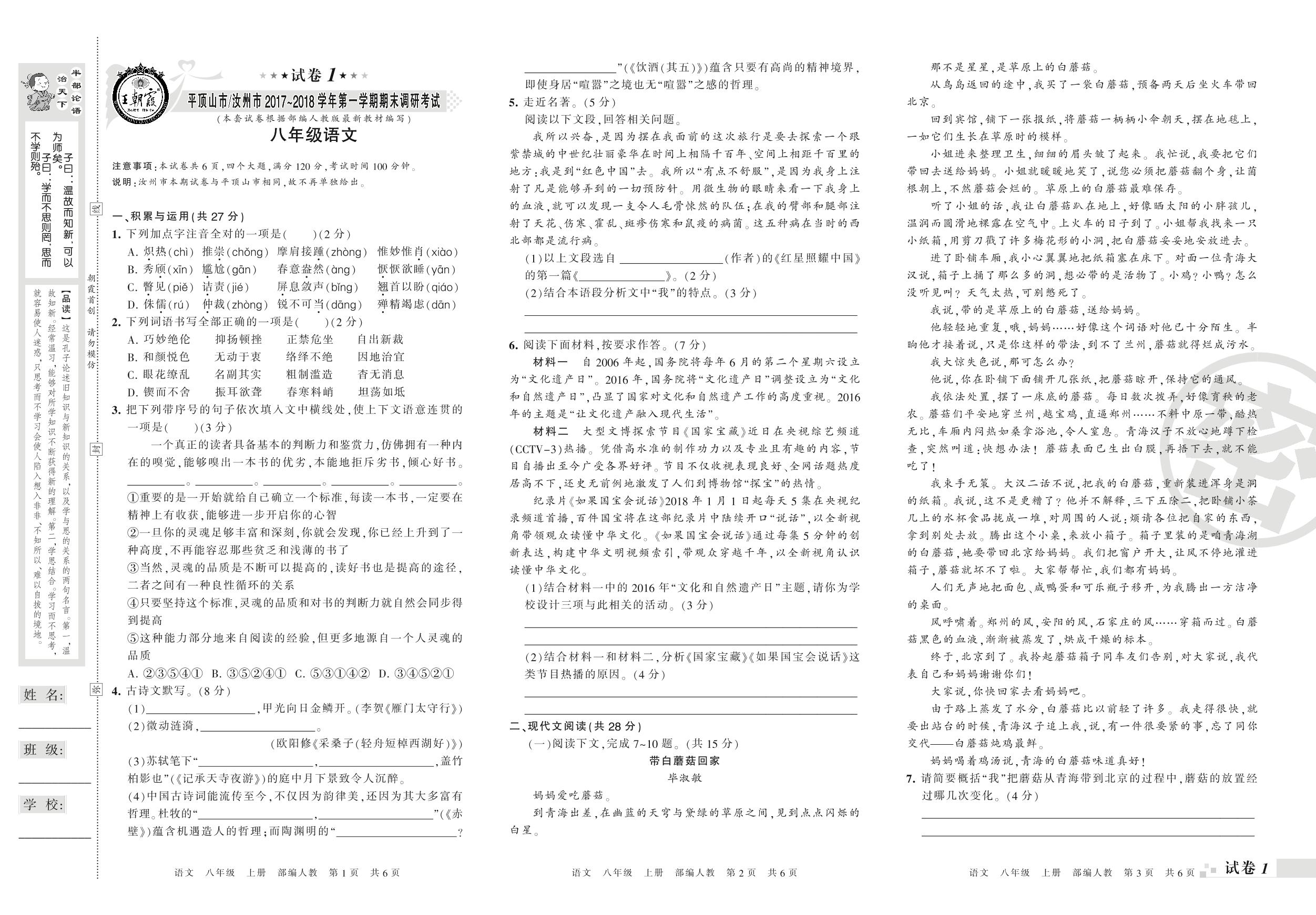 2017-2018学年第一学期平顶山市、汝州市八年级语文试卷(人教版)【1】
