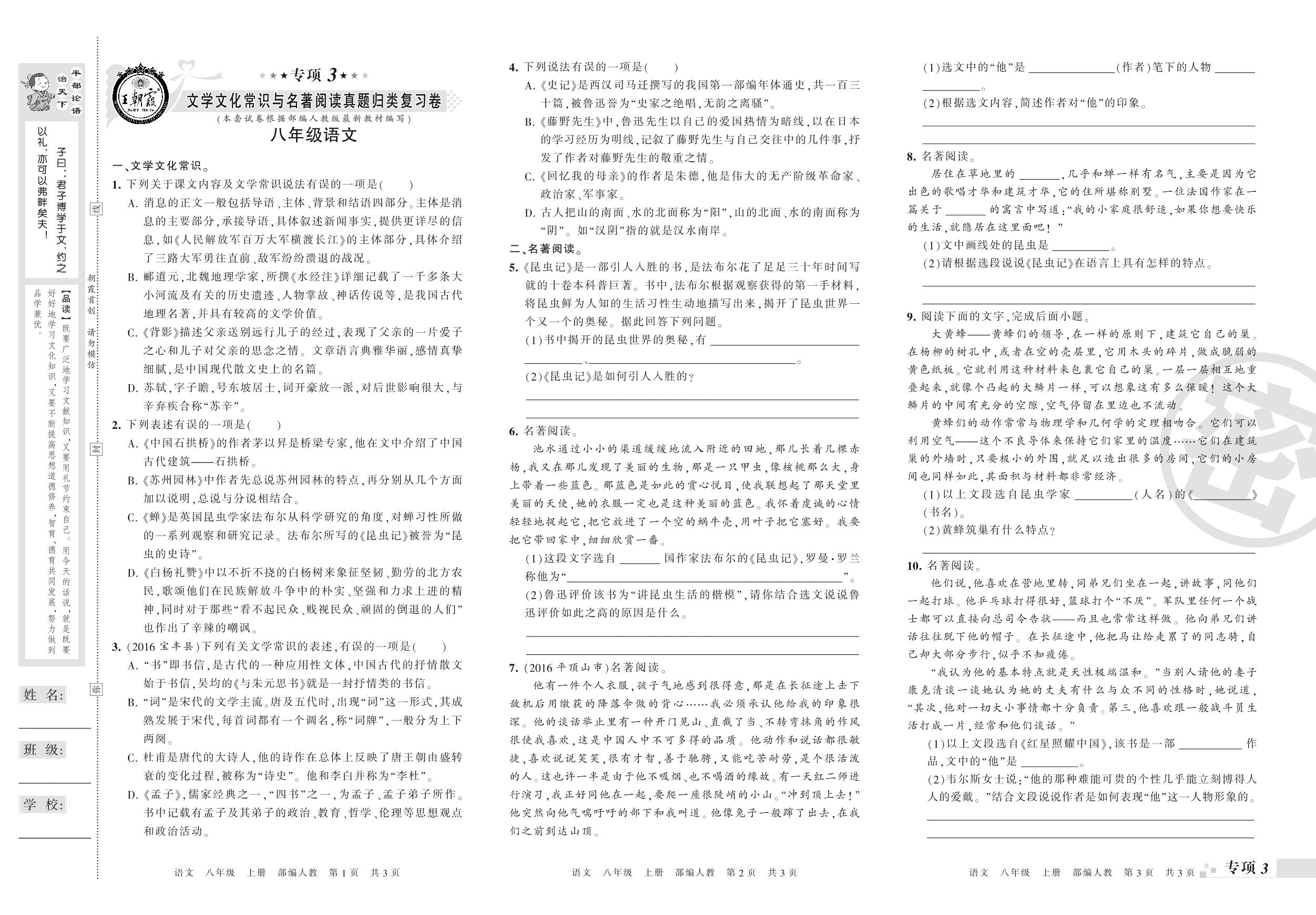 王朝霞期末专项卷——文学文化常识与名著阅读、综合性学习真题归类复习卷八年级上册语文(人教版)【0】