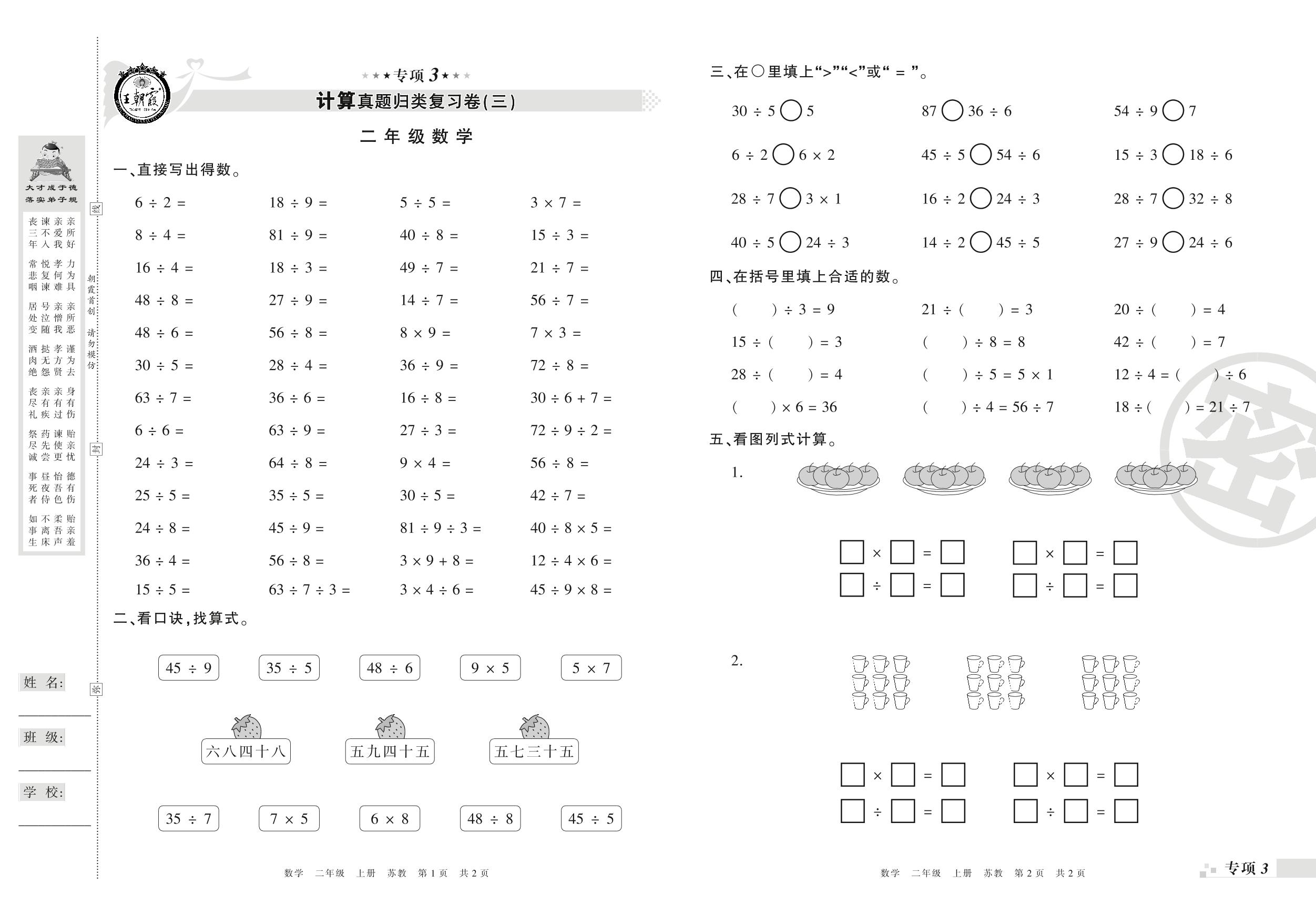 王朝霞期末专项卷——计算(三)、解决问题真题归类复习卷二年级上册数学(苏教版)【0】