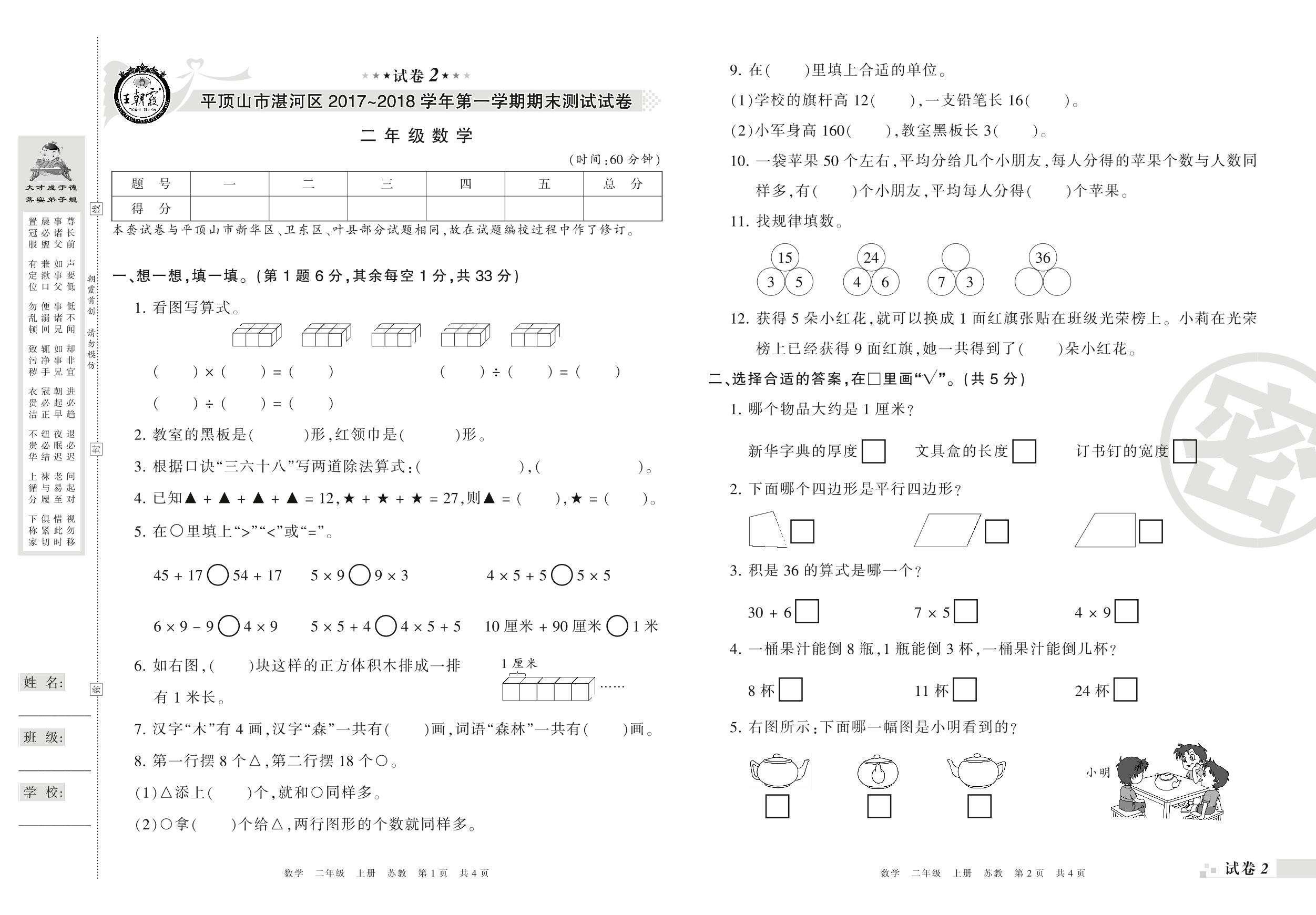 2017-2018学年第一学期平顶山市湛河区二年级数学试卷(苏教版)【2】