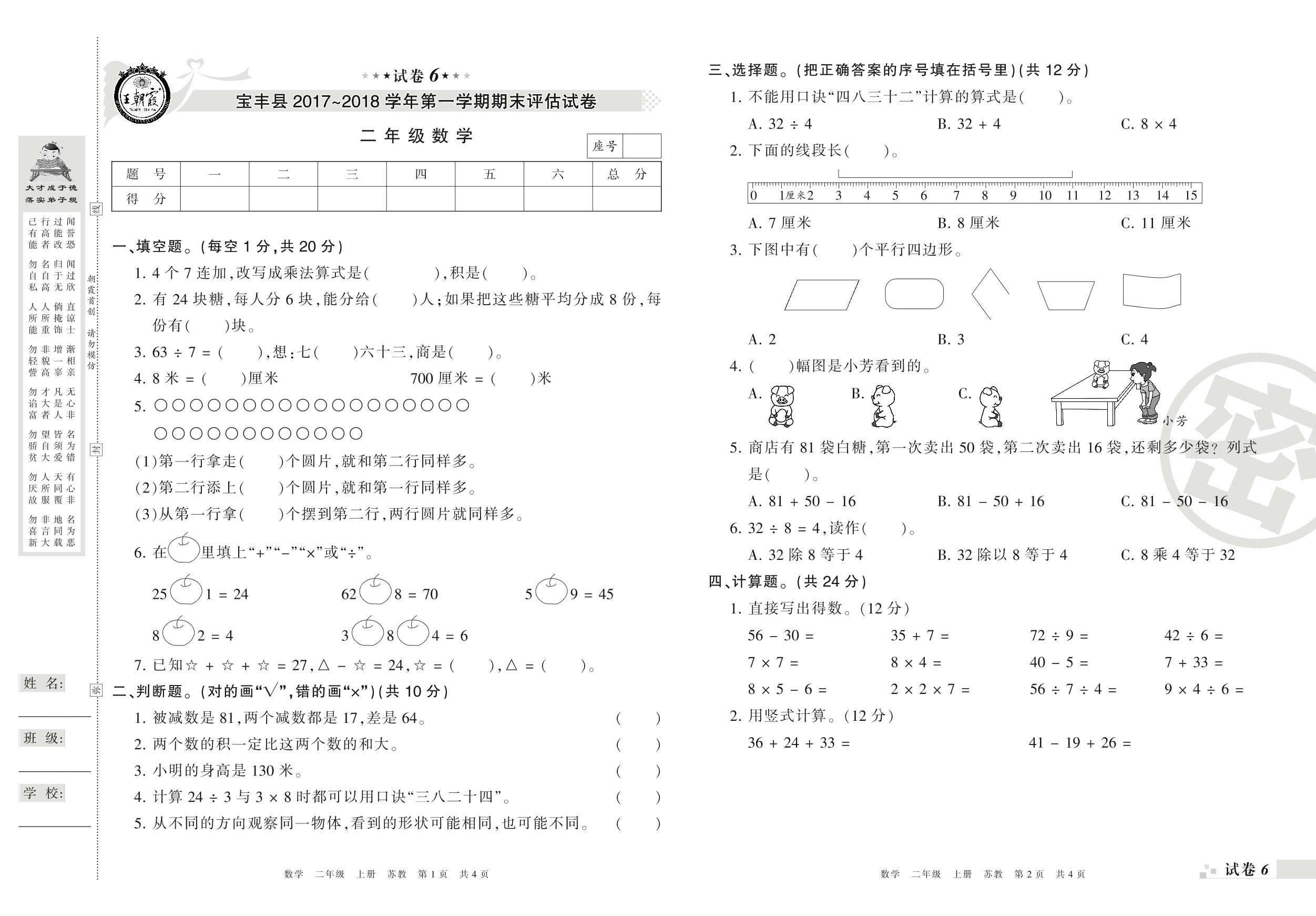 2017-2018学年第一学期宝丰县二年级数学试卷(苏教版)【6】