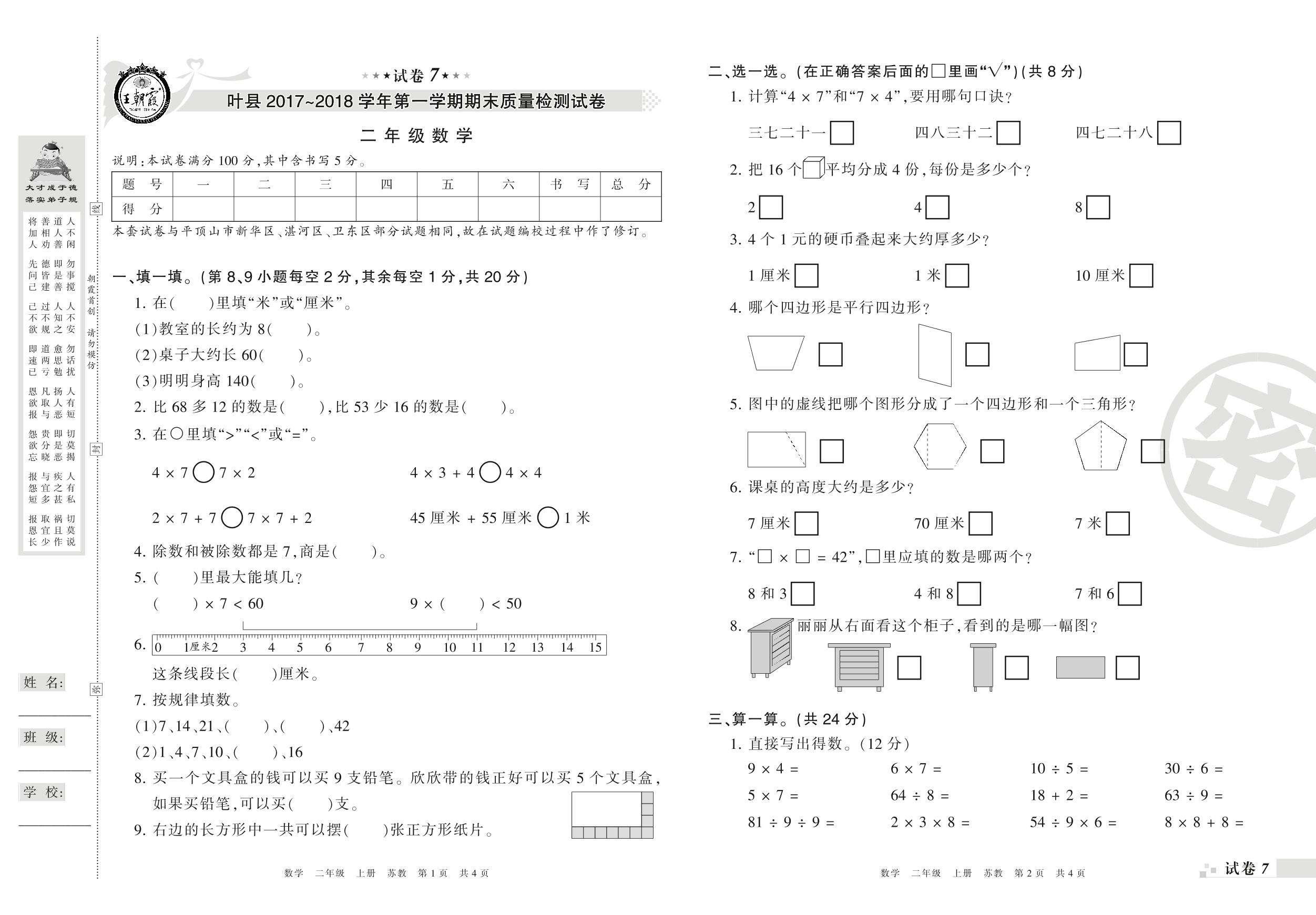 2017-2018学年第一学期叶县二年级数学试卷(苏教版)【7】