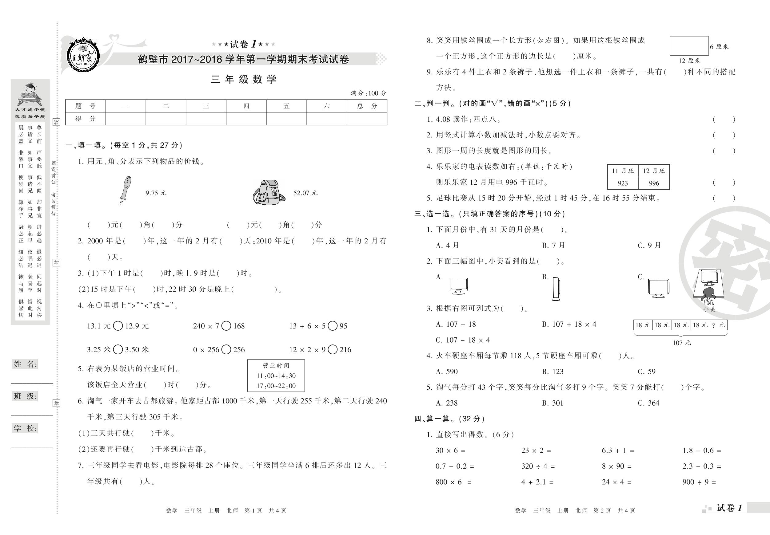 2017-2018学年第一学期鹤壁市三年级数学试卷(北师版)【1】