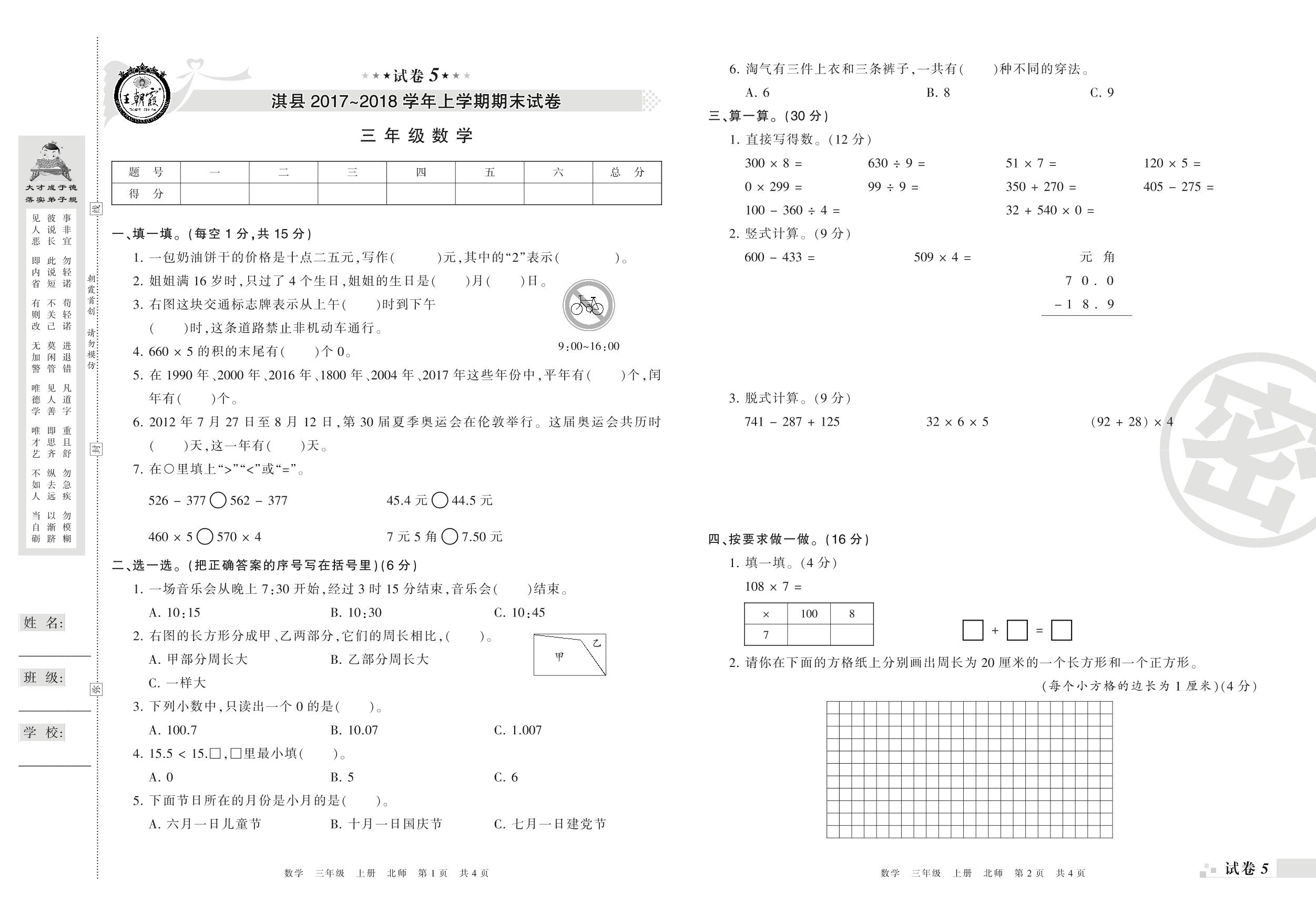 2017-2018学年第一学期鹤壁市淇县三年级数学试卷(北师版)【5】