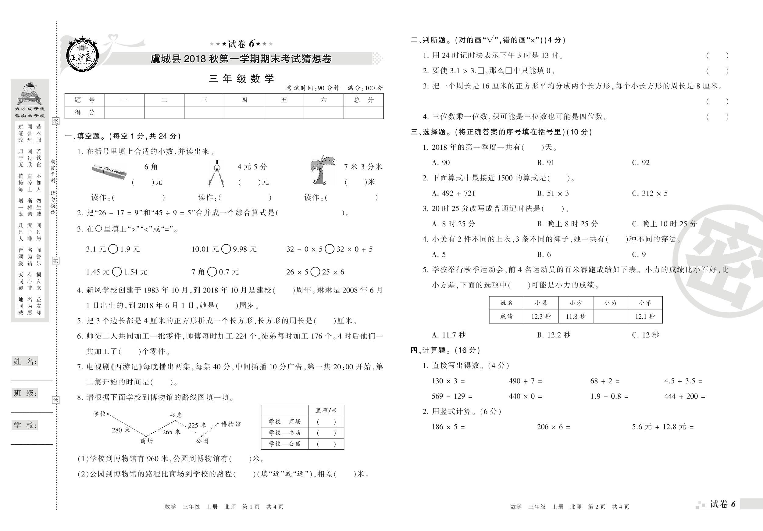 2017-2018学年第一学期商丘市虞城县猜想卷三年级数学试卷(北师版)【6】