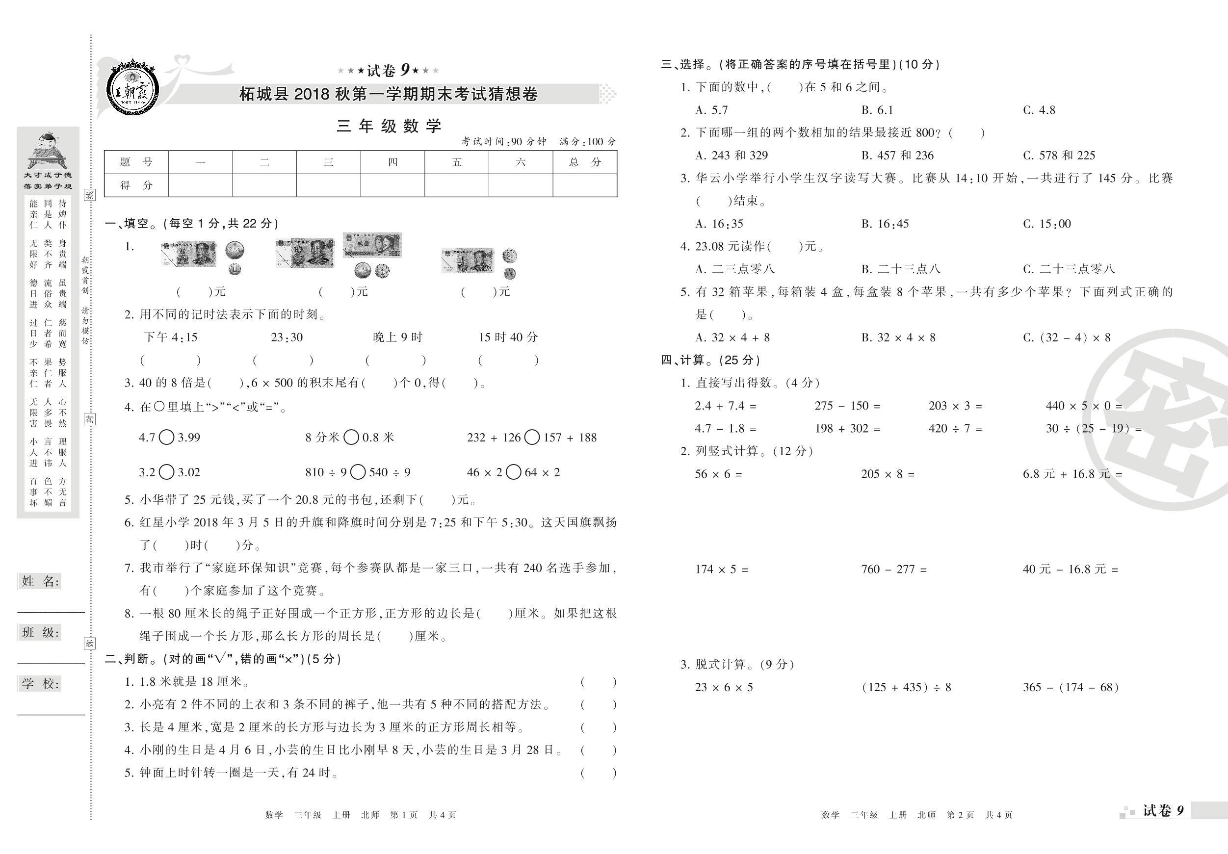 2017-2018学年第一学期商丘市柘城县猜想卷三年级数学试卷(北师版)【9】