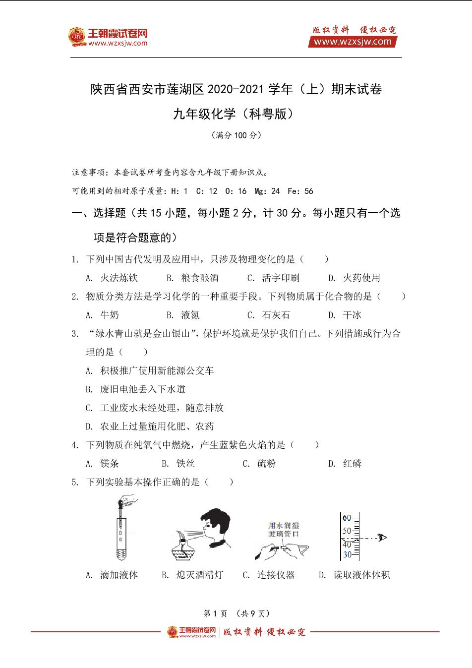 陕西省西安市莲湖区2020-2021学年(上)九年级化学期末试卷(科粤版)