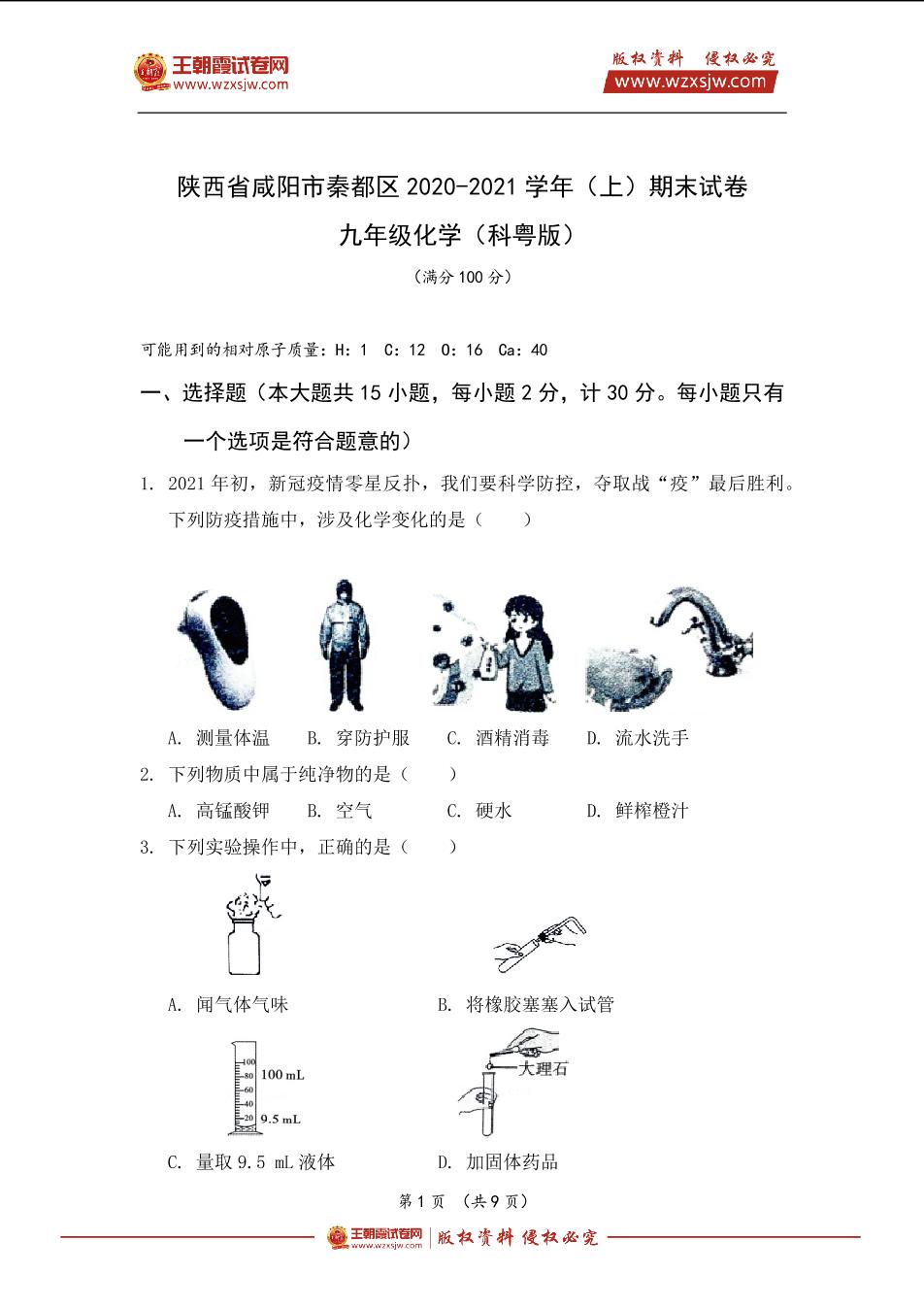 陕西省咸阳市秦都区2020-2021学年(上)九年级化学期末试卷(科粤版)
