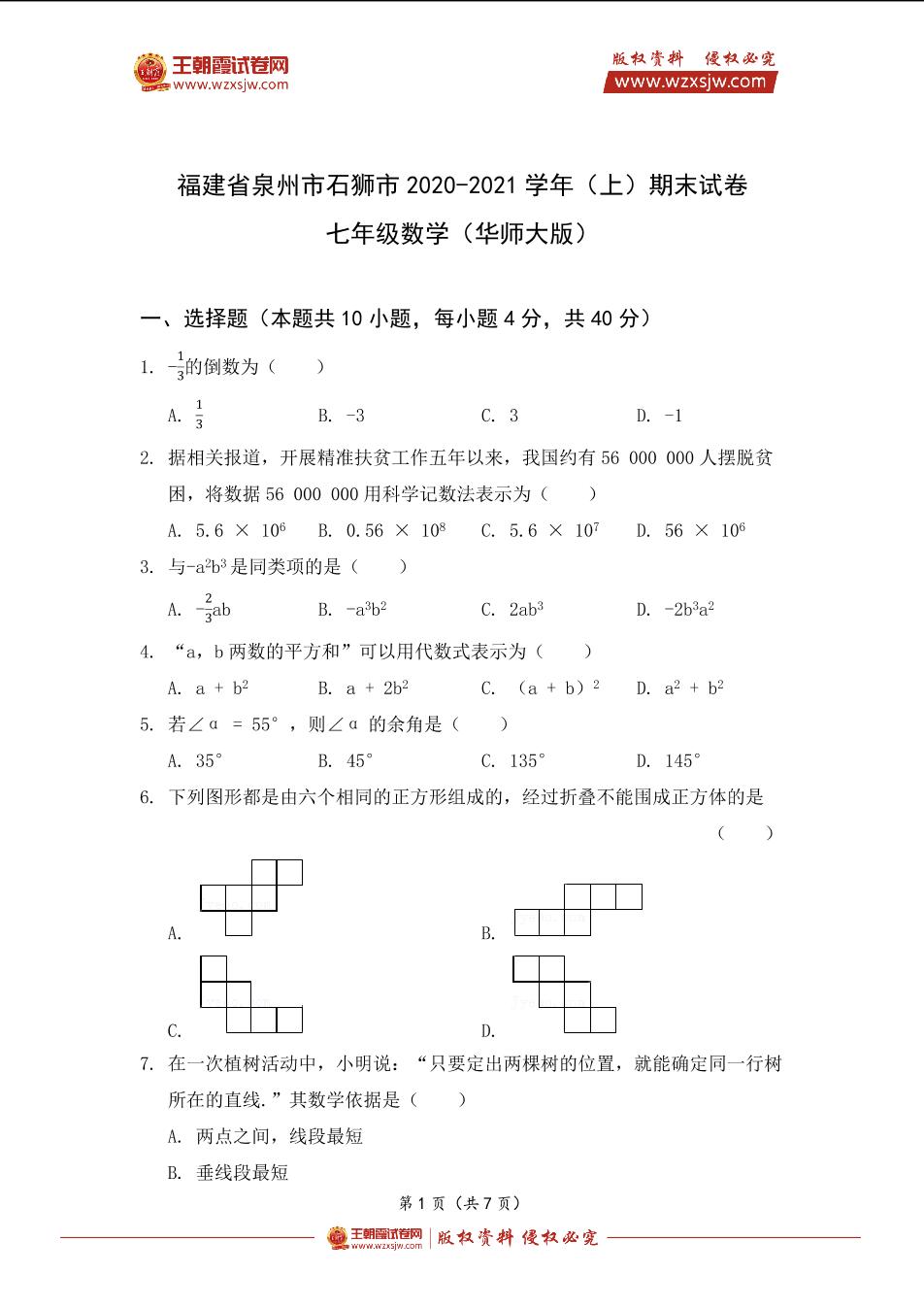 福建省泉州市石狮市2020-2021学年(上)期末试卷七年级数学(华师大版)