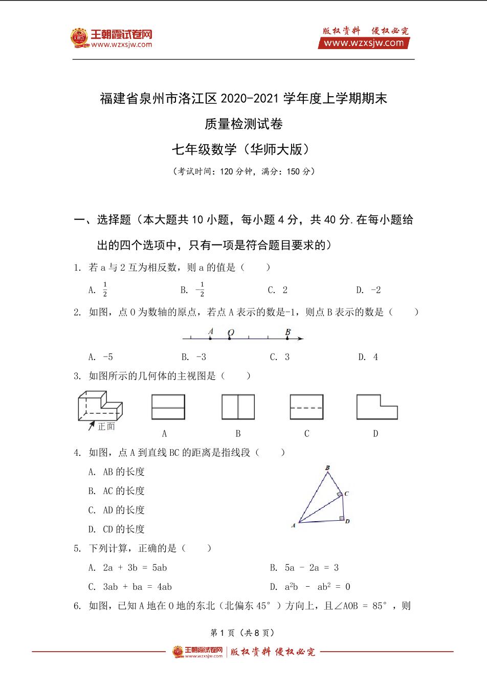 福建省泉州市洛江区2020-2021学年度上学期期末质量检测试卷七年级数学(华师大版)