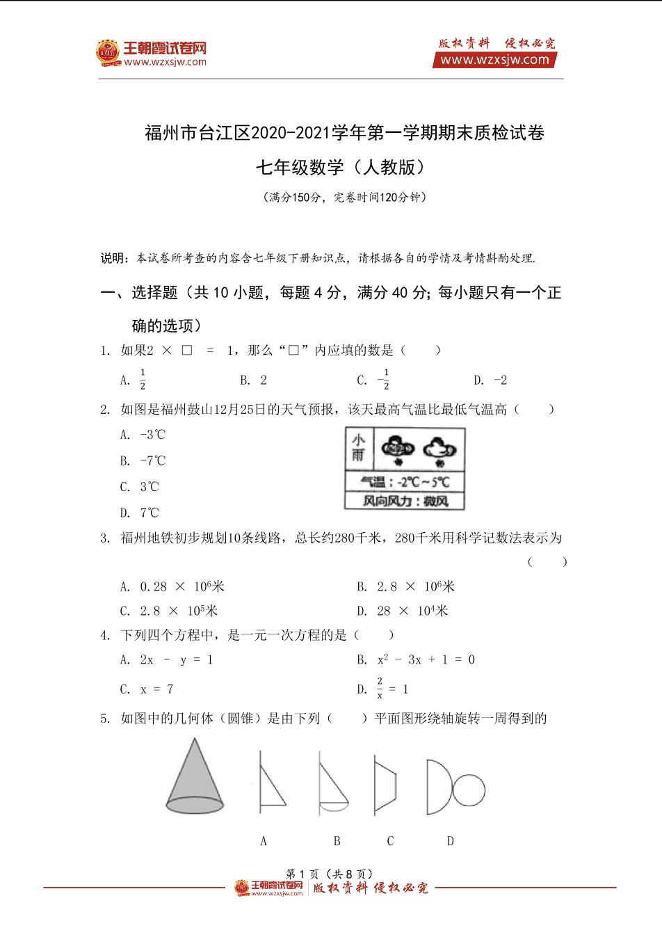 福州市台江区2020—2021学年第一学期期末质检试卷七年级数学(人教版)