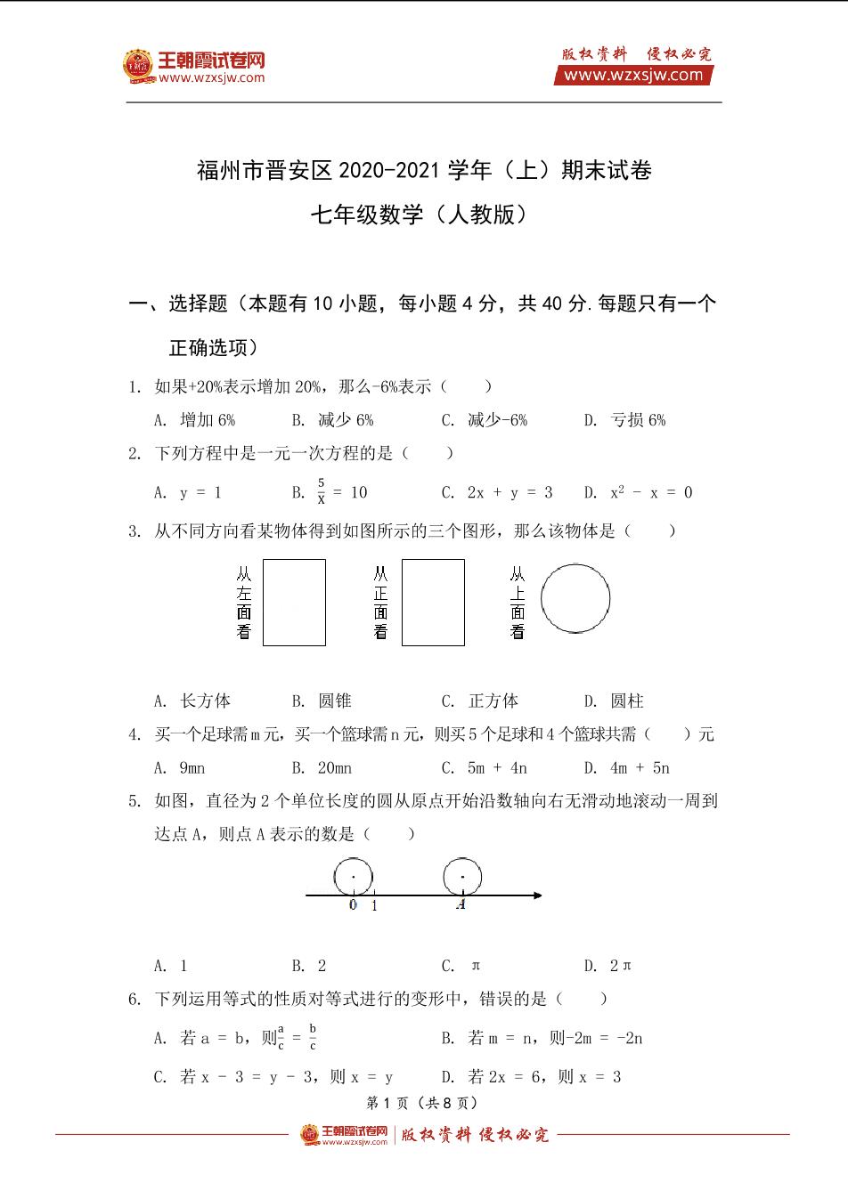 福州市晋安区2020-2021学年上学期初中七年级期末考试数学试卷(人教版)