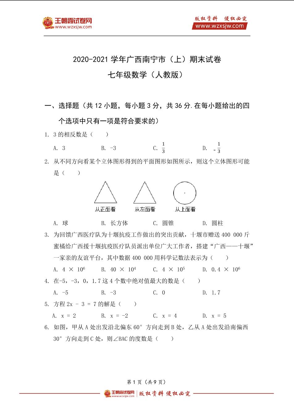 2020~2021学年广西南宁市七年级(上)期末数学试卷(人教版)