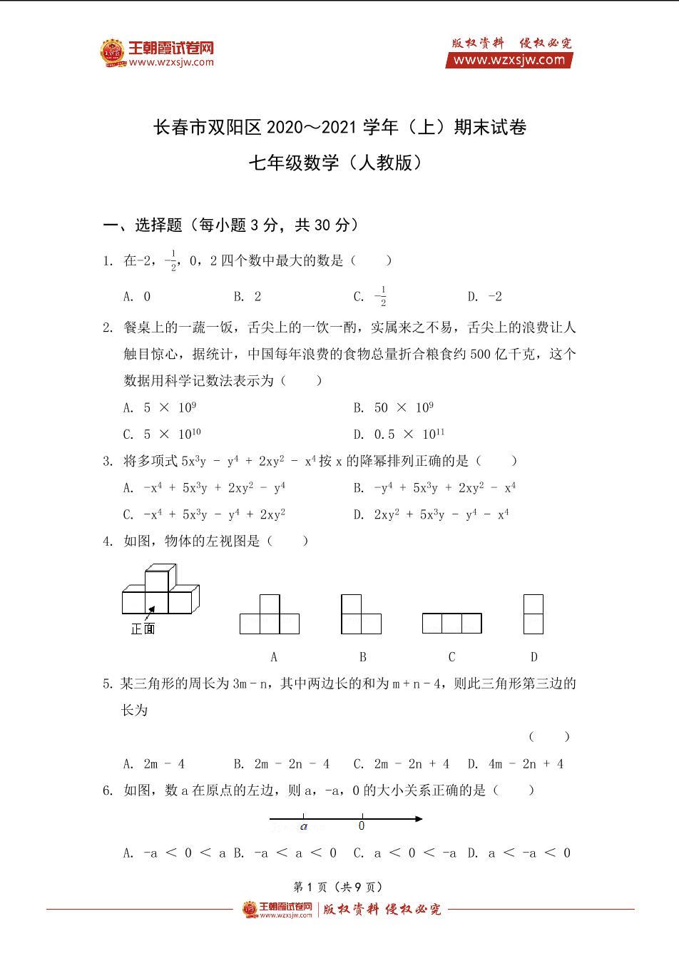 长春市双阳区2020~2021学年(上)期末试卷七年级数学(人教版)